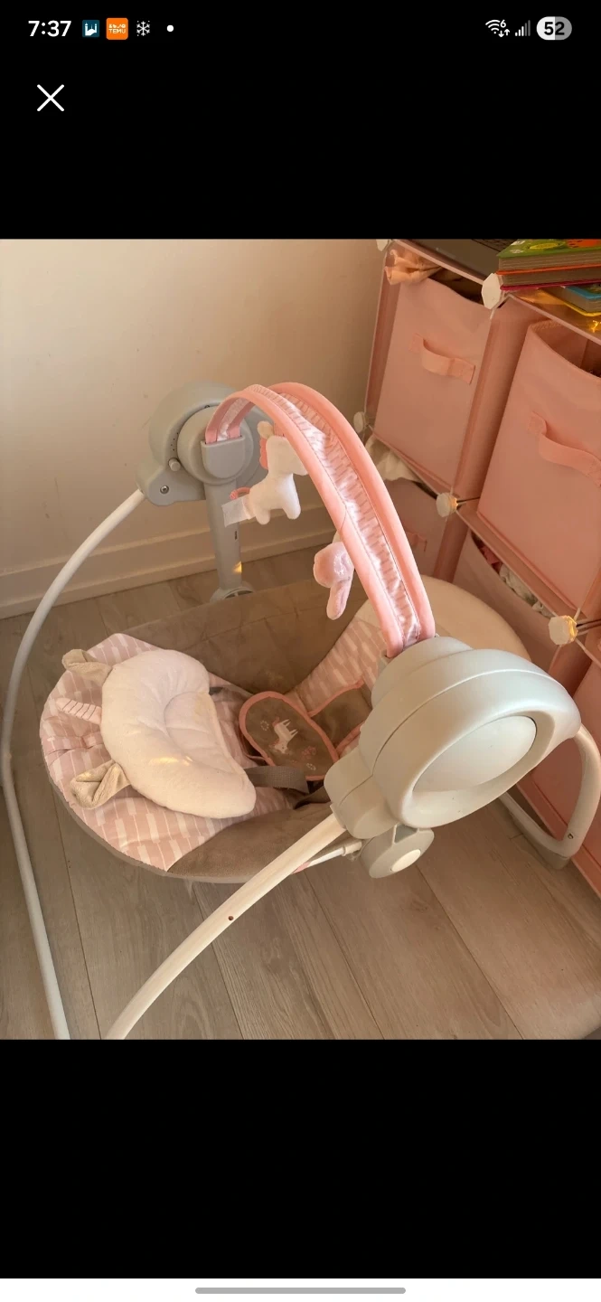 This Graco baby swing offers a cozy spot for your little one. It features a soft seat with plush padding and an overhead toy bar with dangling toys. The gentle swinging motion helps soothe babies.