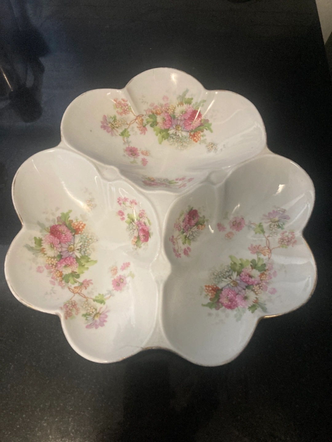 Selling an antique floral divided serving dish. It's perfect for serving snacks or appetizers. The dish is in good condition and ready to add a touch of elegance to your table