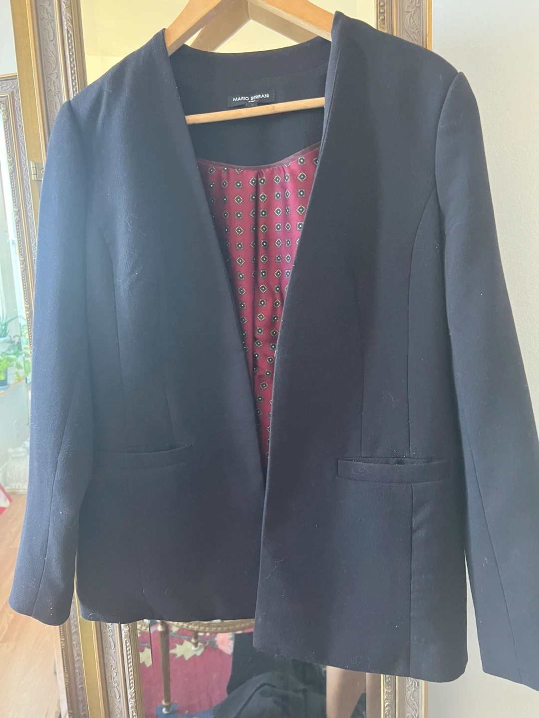 Selling a Mario Zerrani blazer in black. It features a unique red patterned lining. Please note there is some wear and tear on the lining.Very light and practical to wear. Stylish.Price can be adjusted. Has Good Karma!