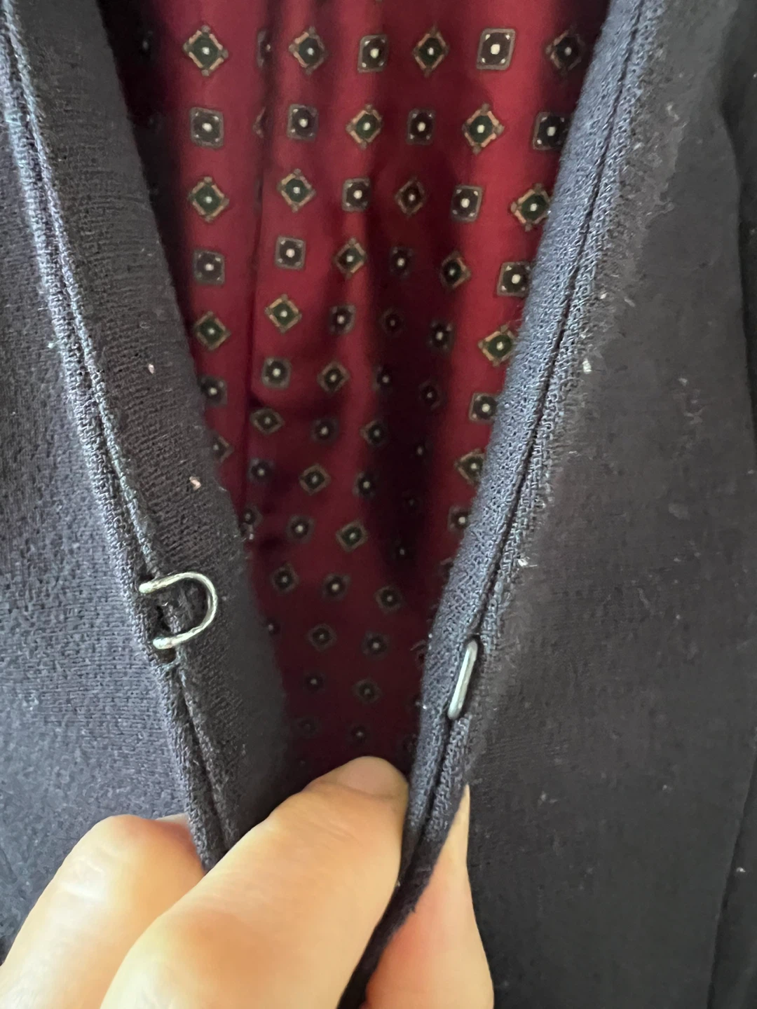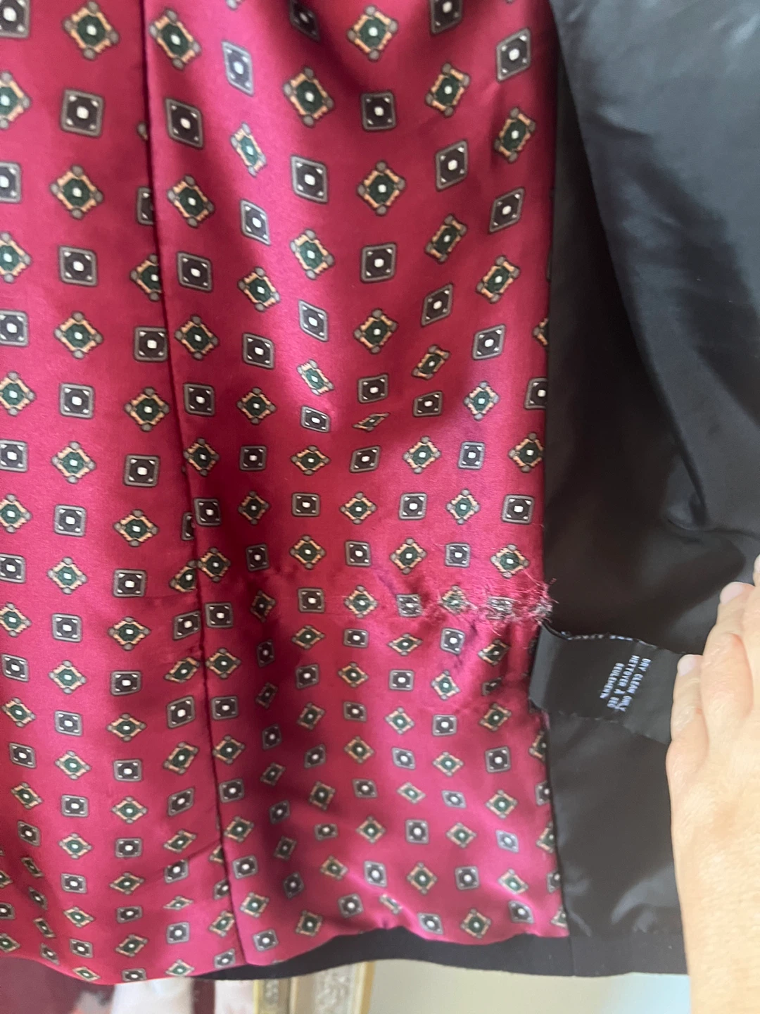 Selling a Mario Zerrani blazer in black. It features a unique red patterned lining. Please note there is some wear and tear on the lining.Very light and practical to wear. Stylish.Price can be adjusted. Has Good Karma!