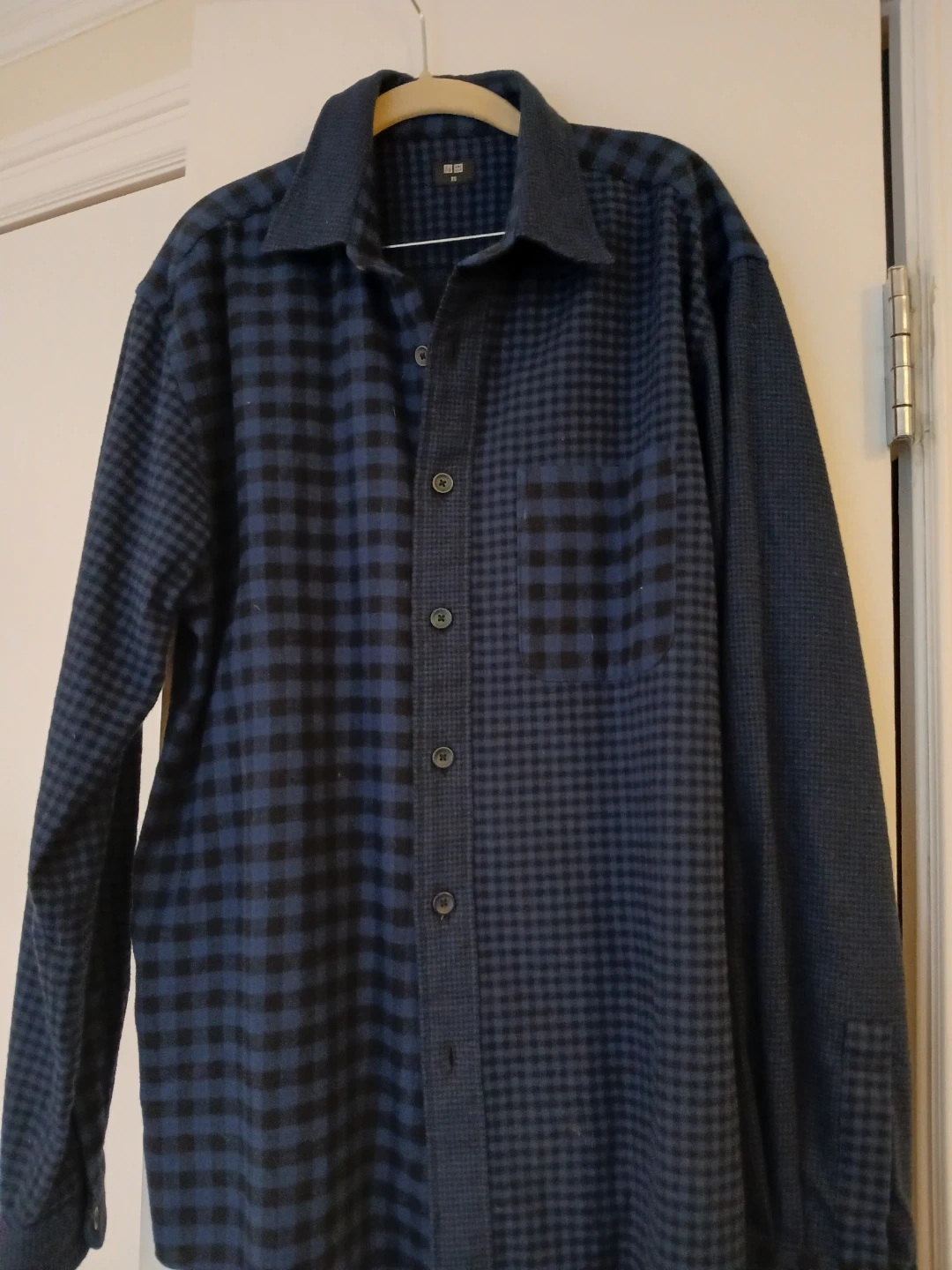 Here's a gently used Uniqlo flannel shirt in a blue plaid pattern. It's a size XS and has a classic, comfortable fit. Perfect for layering or wearing on its own!
