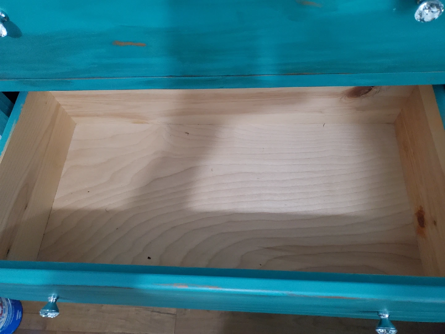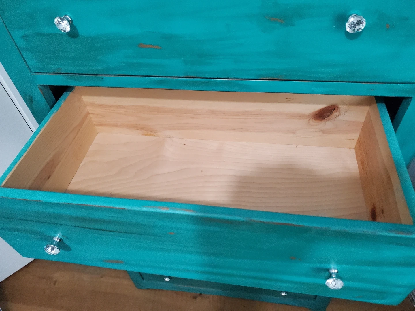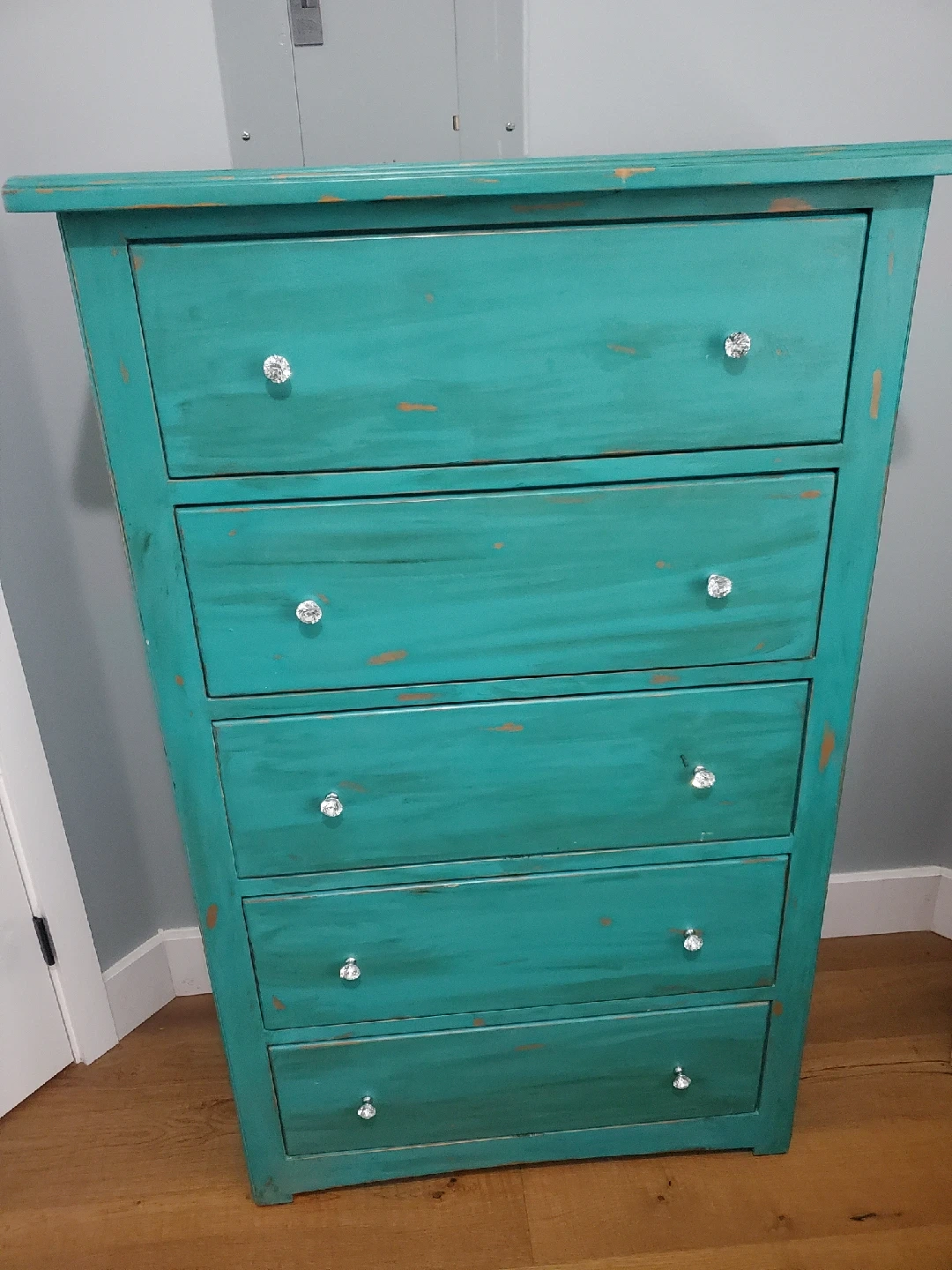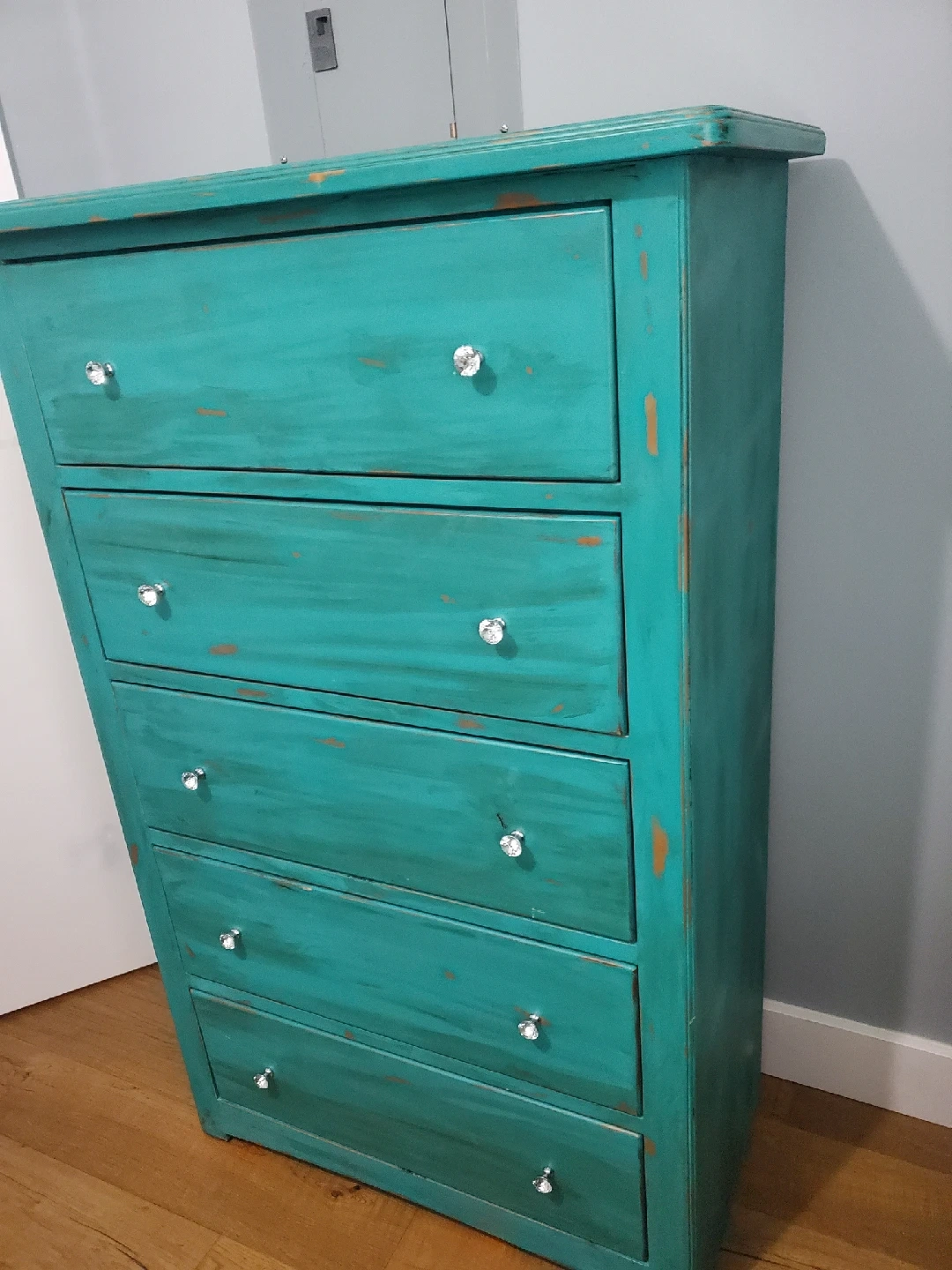Selling a lovely turquoise dresser with five drawers. It has crystal-style knobs and a distressed finish, giving it a unique, rustic look. Perfect for adding a pop of colour to any room! Solid wood!