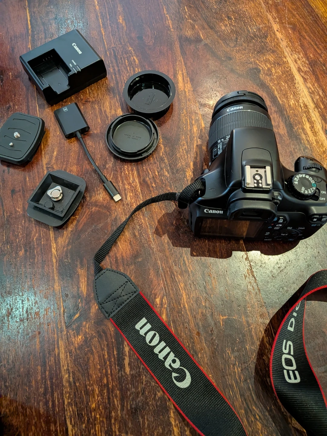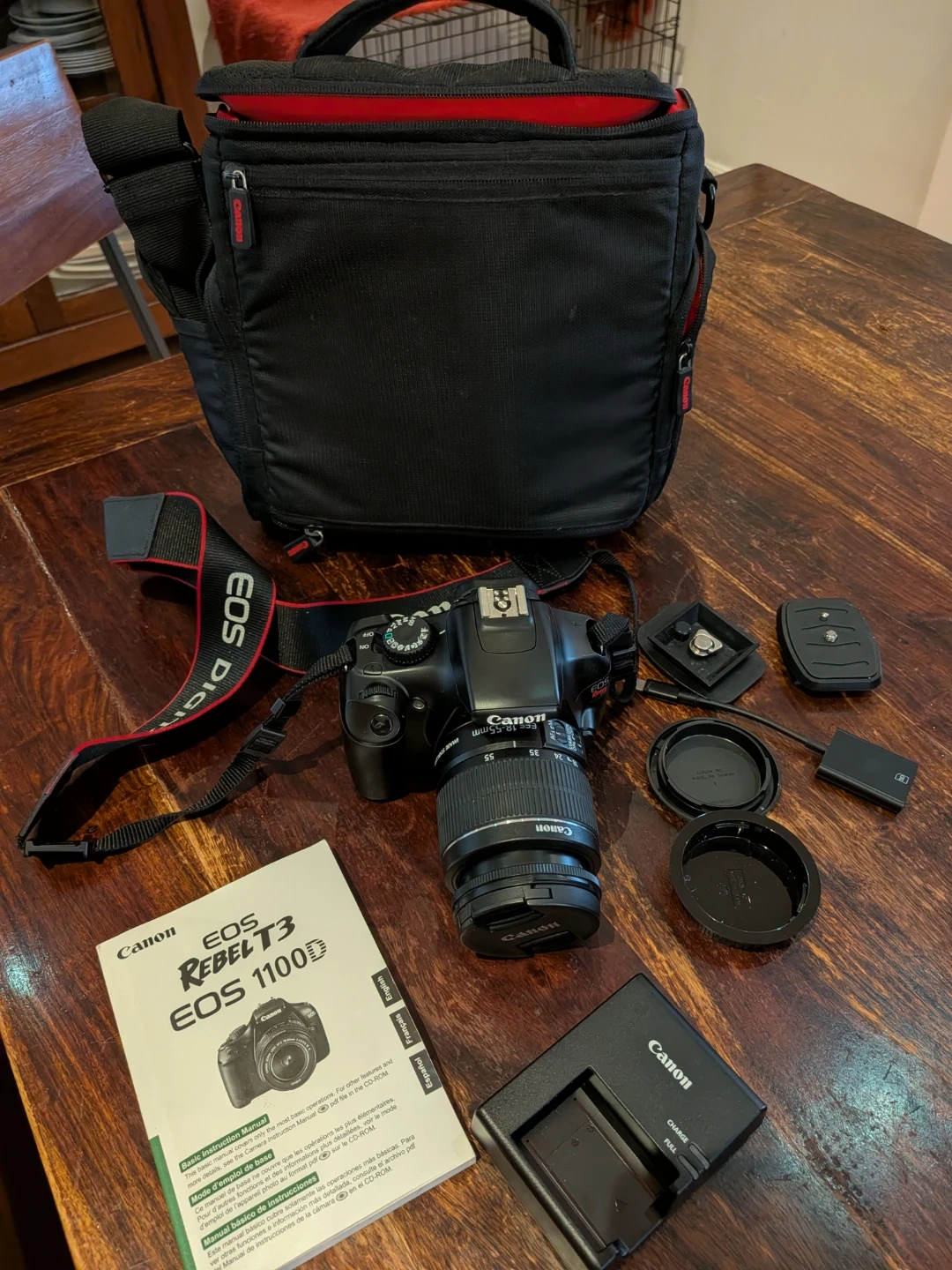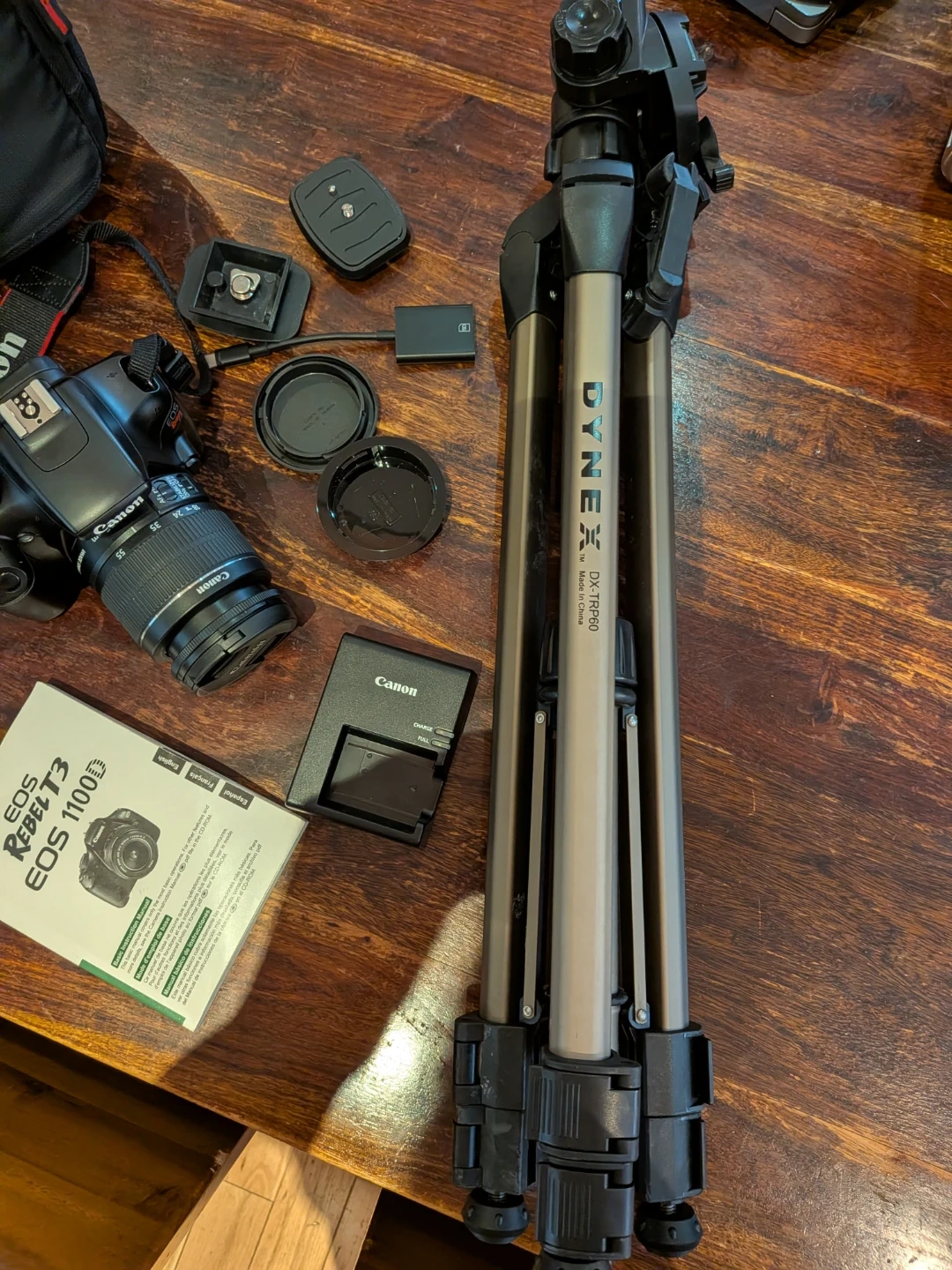 Selling a Canon EOS Rebel T3 1100D digital camera with its original strap, charger, and a carrying bag. Includes a Dynex tripod and various accessories like lens caps and mounting plates. This camera kit is great for beginners wanting to explore photography!