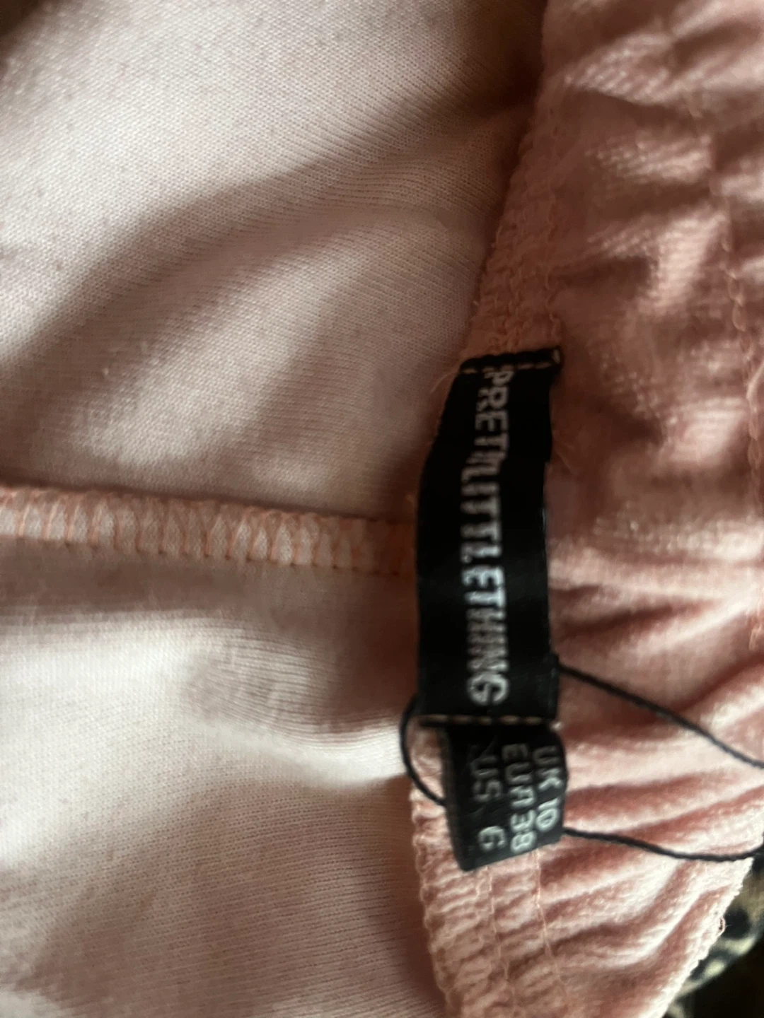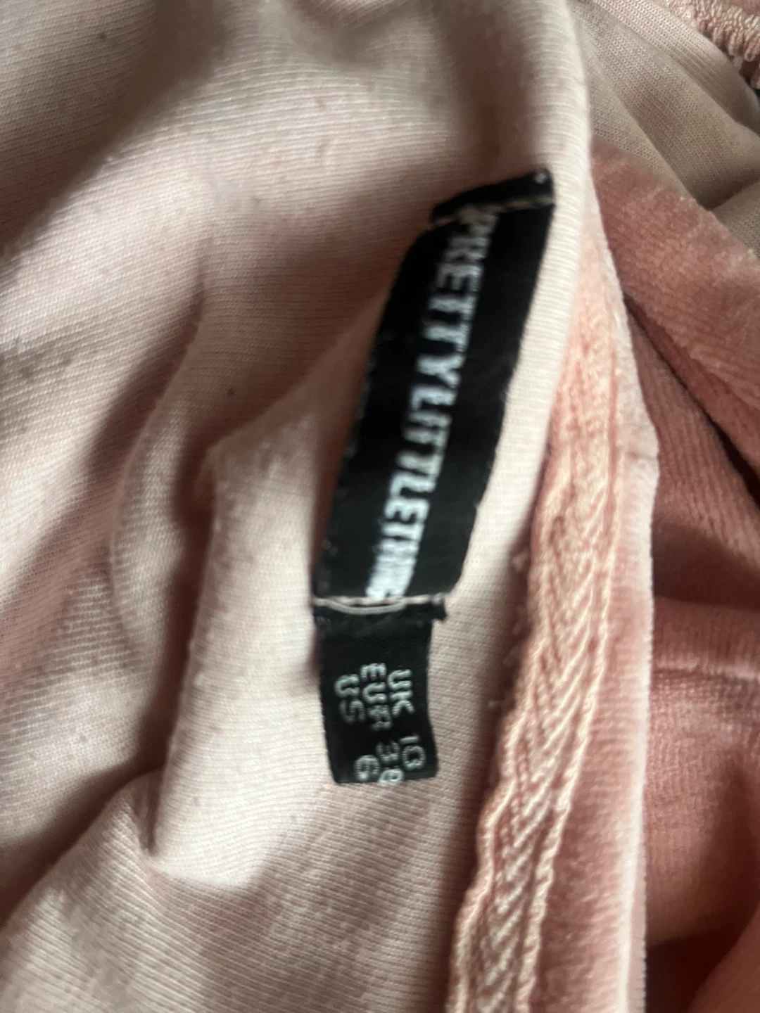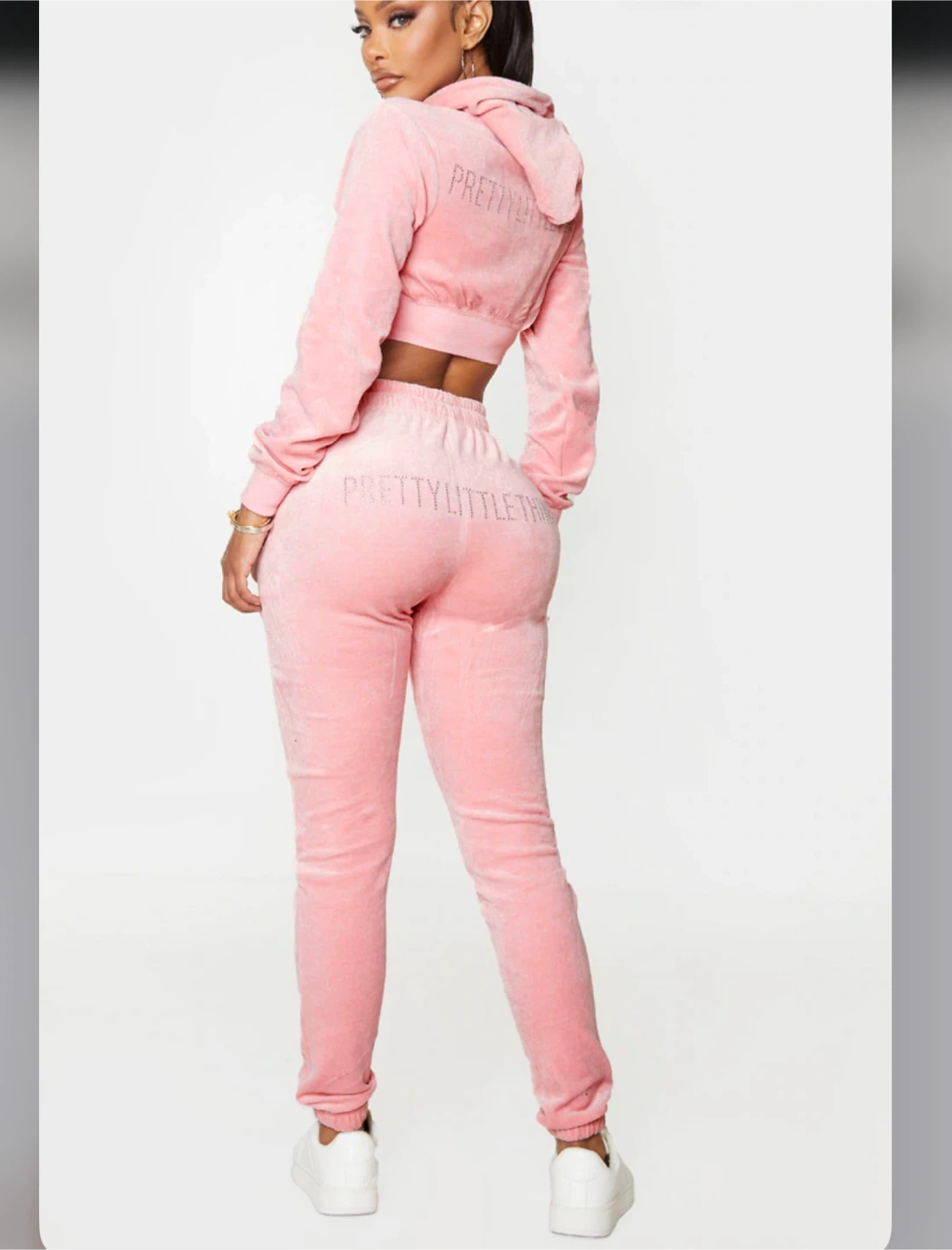 This is a pink velour tracksuit set from Pretty Little Thing. It's a US size 6. This set includes a cropped hoodie and matching bottoms both have rhinestones