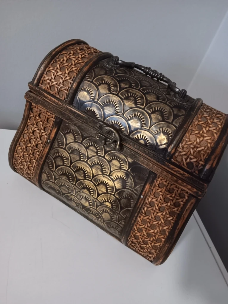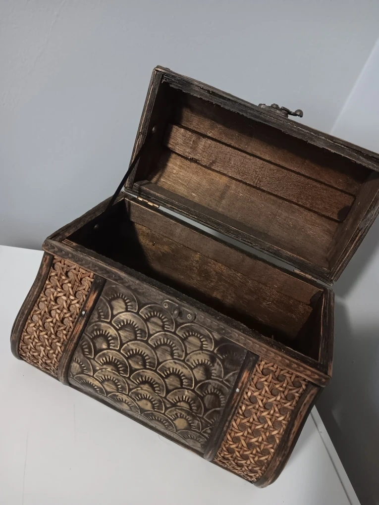 This decorative treasure chest box is made of wood with intricate woven details and a metal clasp. It's perfect for storing small trinkets or keepsakes. The interior is lined and the lid is hinged for easy access.
