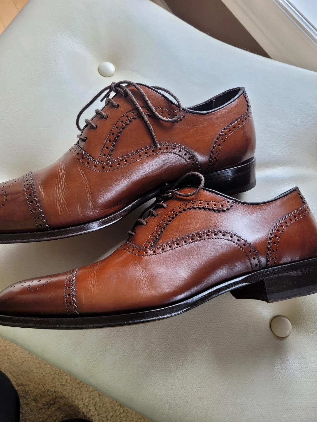 Dress up any outfit with these stylish brown leather cap toe Oxford Brogue shoes from To Boot New York. They're made in Italy and feature a classic wingtip design with decorative perforations. These shoes are perfect for formal occasions or smart casual work wear. Sz 7