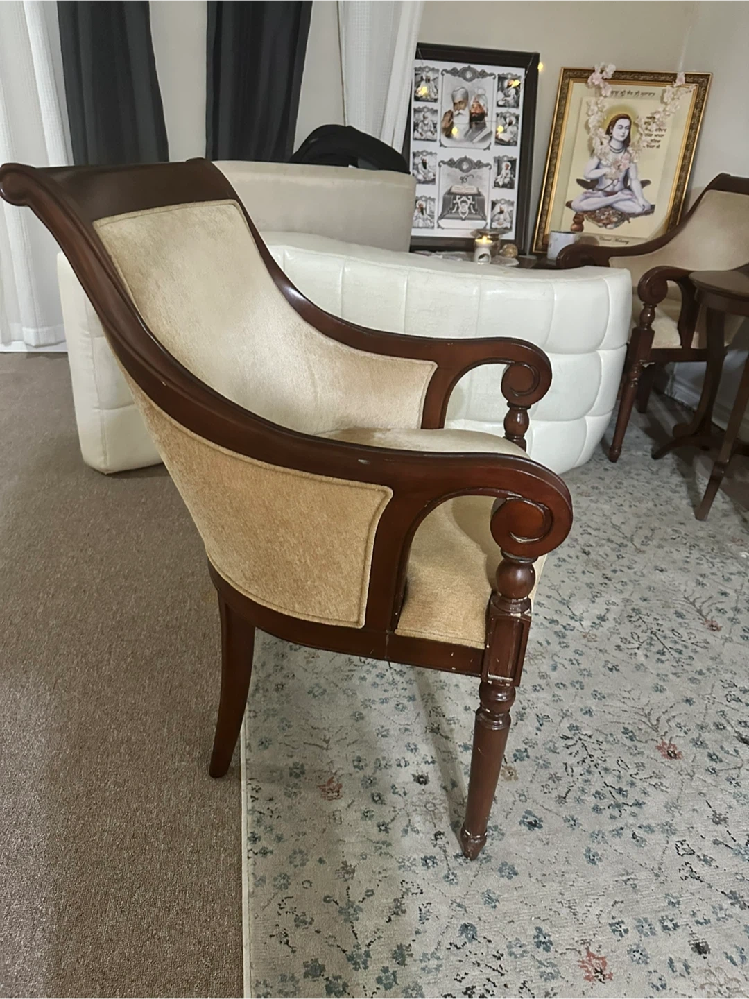 Selling a lovely armchair with a classic, antique-inspired design. It features a dark wood frame and comfortable beige fabric upholstery. It would be a great addition to any living room or study! I have two chairs.