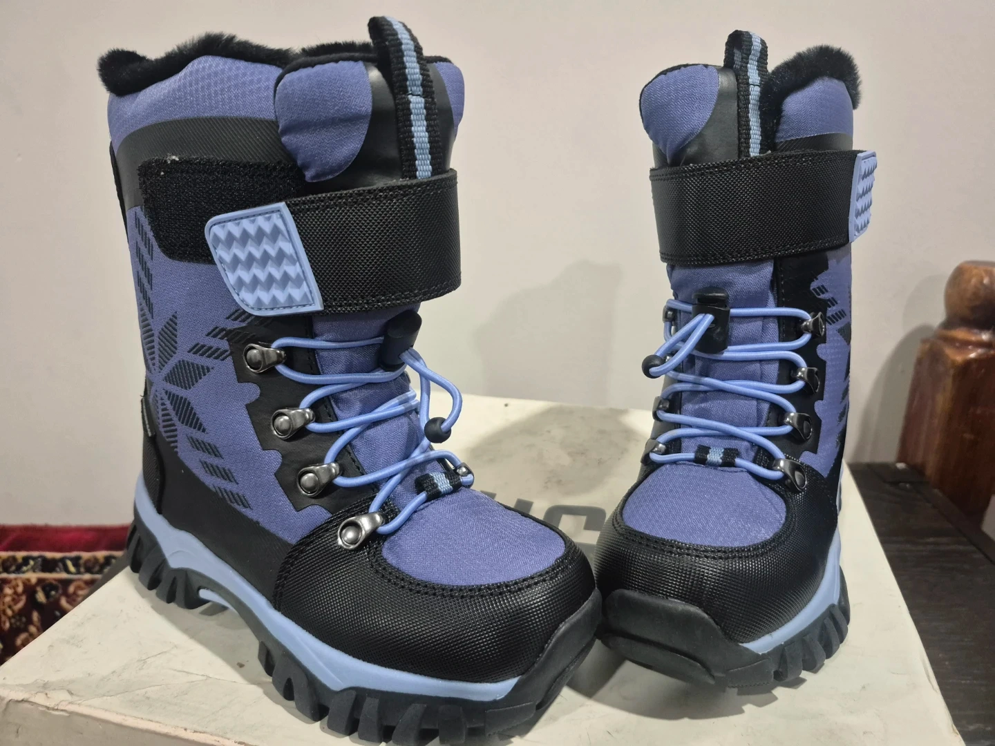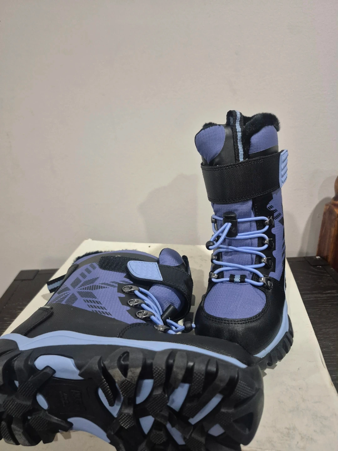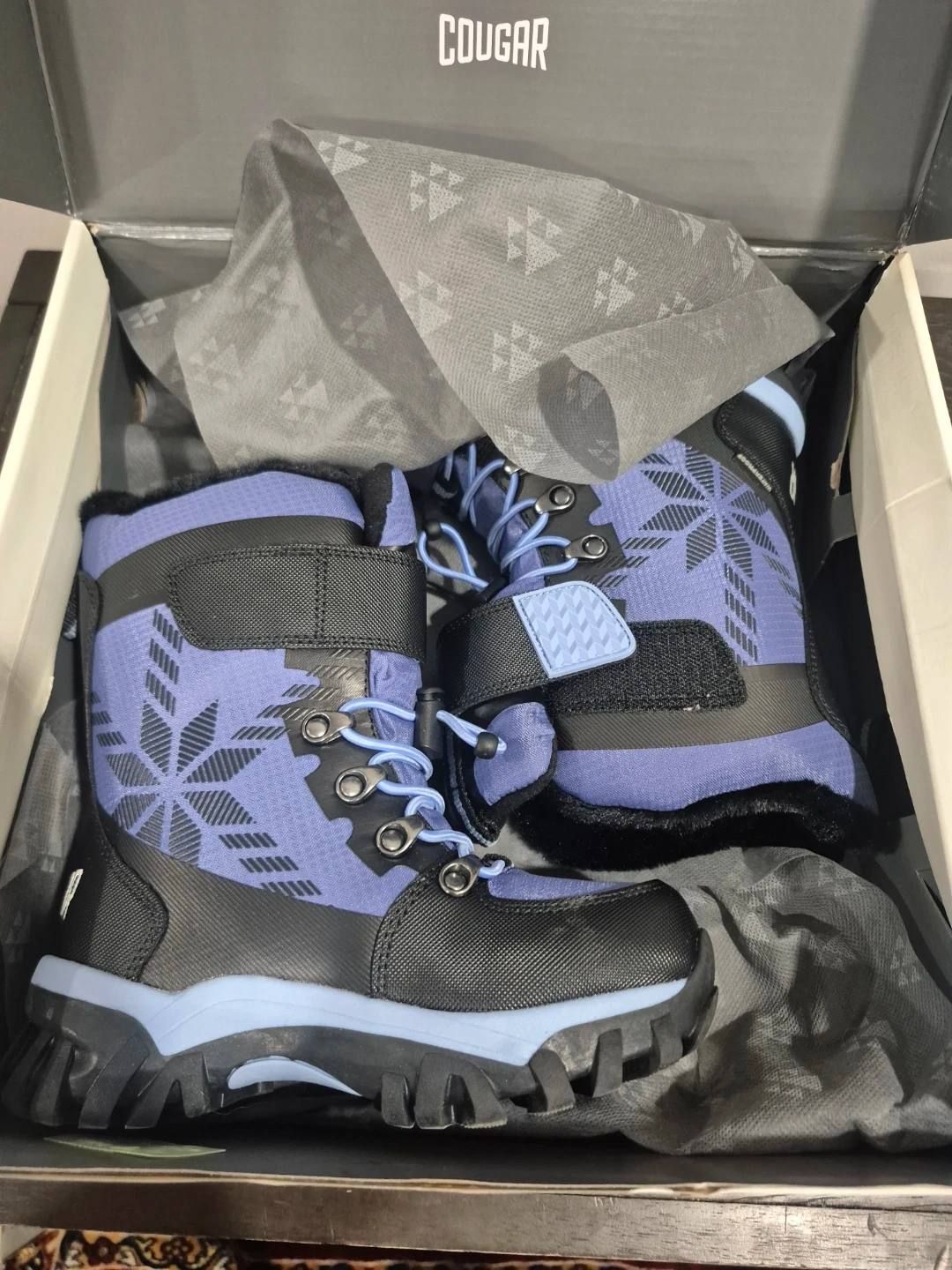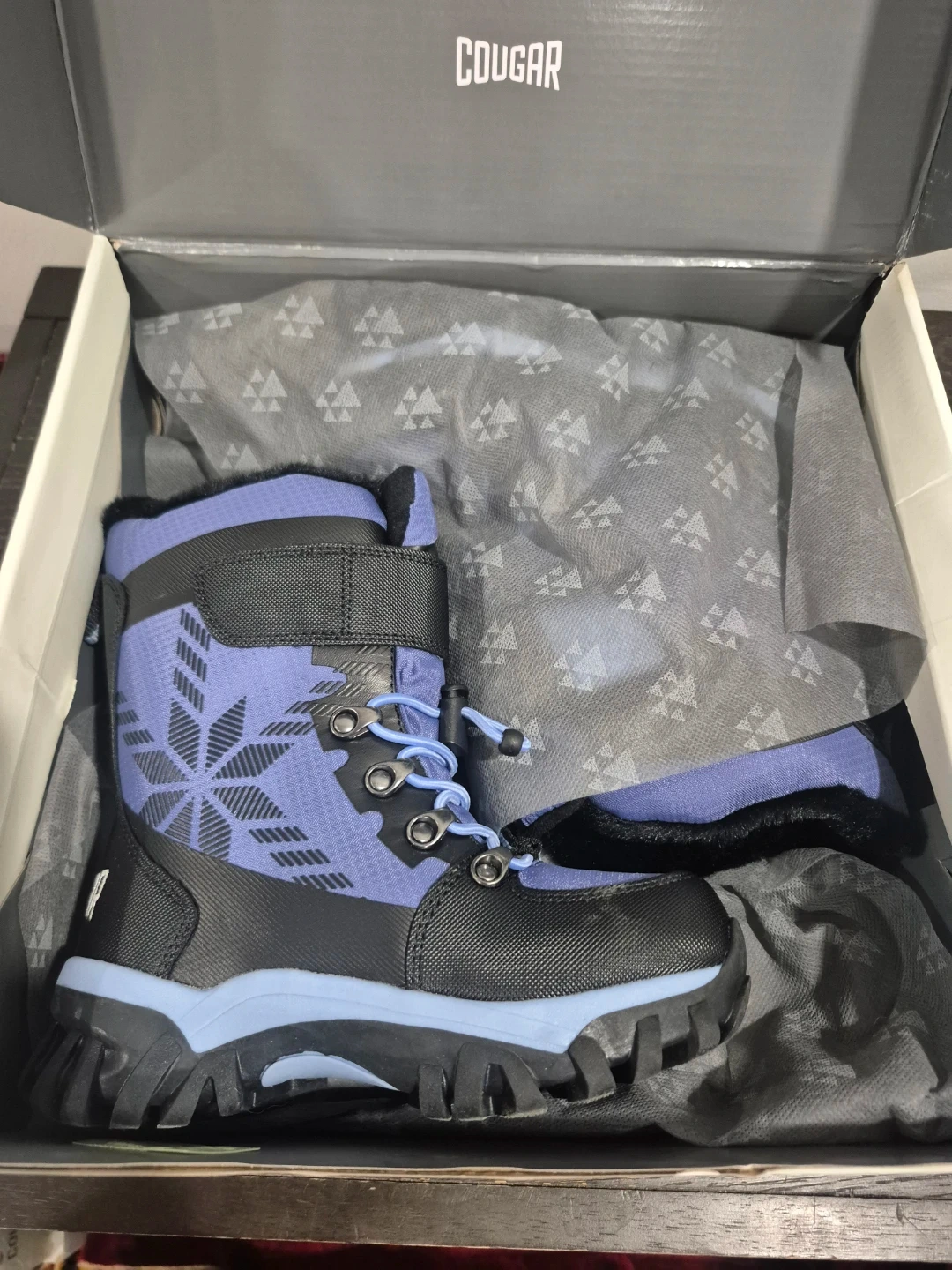 These Cougar winter boots are purple and black with a snowflake design. They feature laces and a velcro strap for a secure fit. The boots have a warm, fuzzy lining. They're great for keeping little feet toasty in the snow!