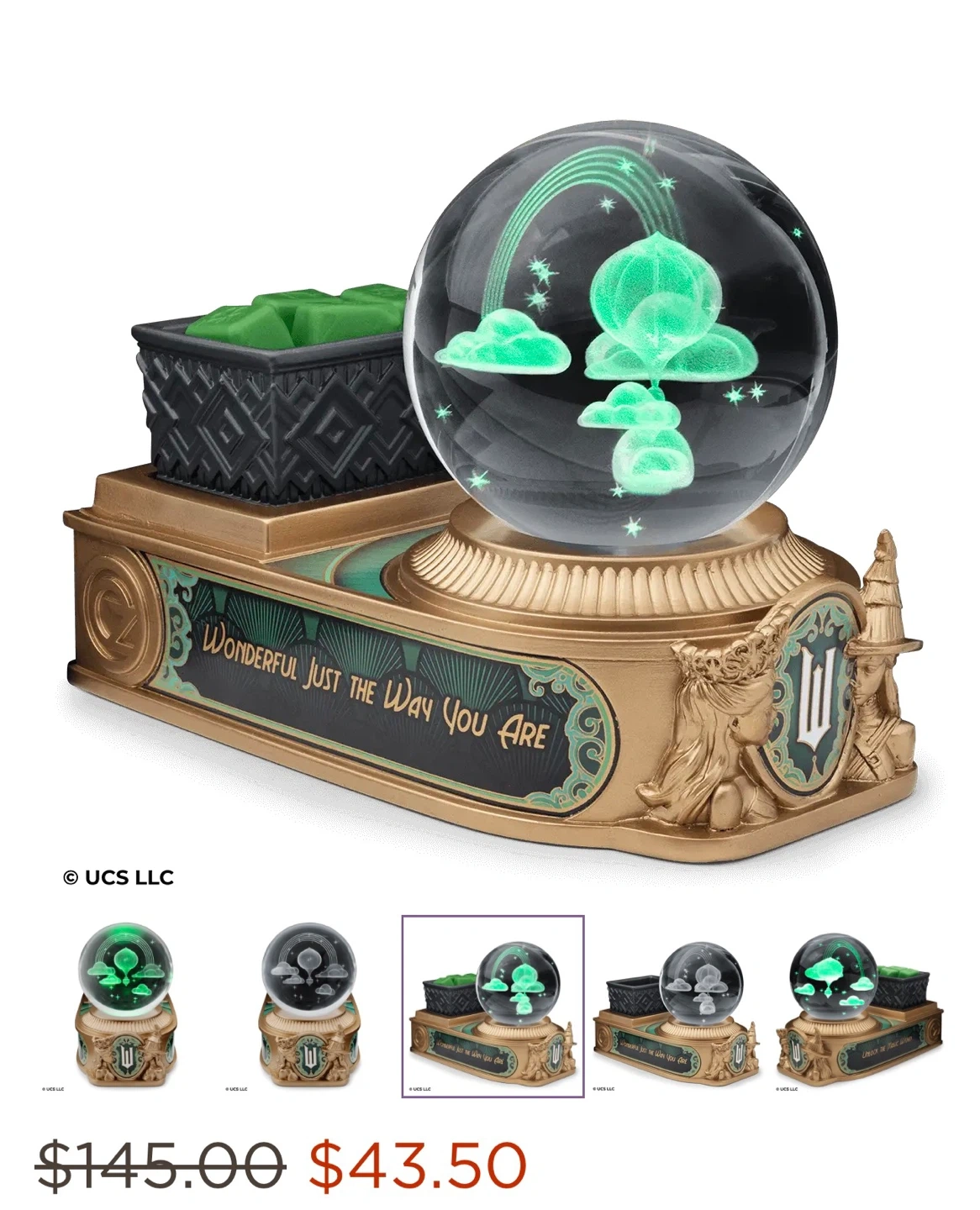 A spellbinding green glow illuminates the laser-etched display within this Warmer’s glass orb when lit. Below, representations of Glinda and Elphaba are rendered in an art deco style reminiscent of the Emerald City from Wicked. Each side of the base features a phrase inspired by a story of two halves