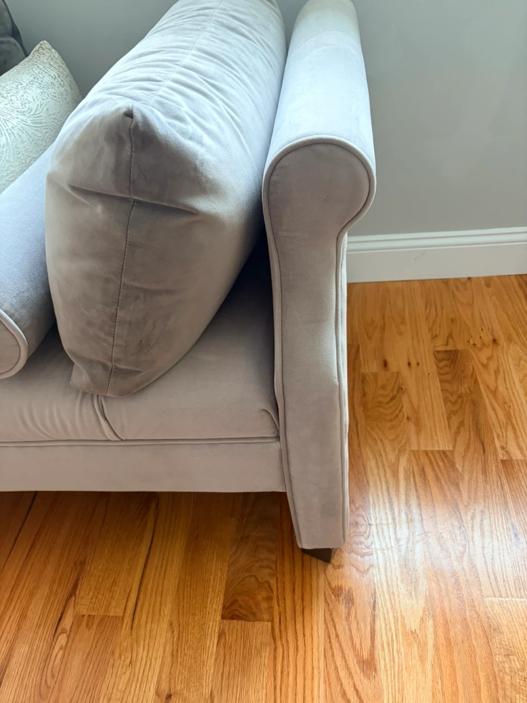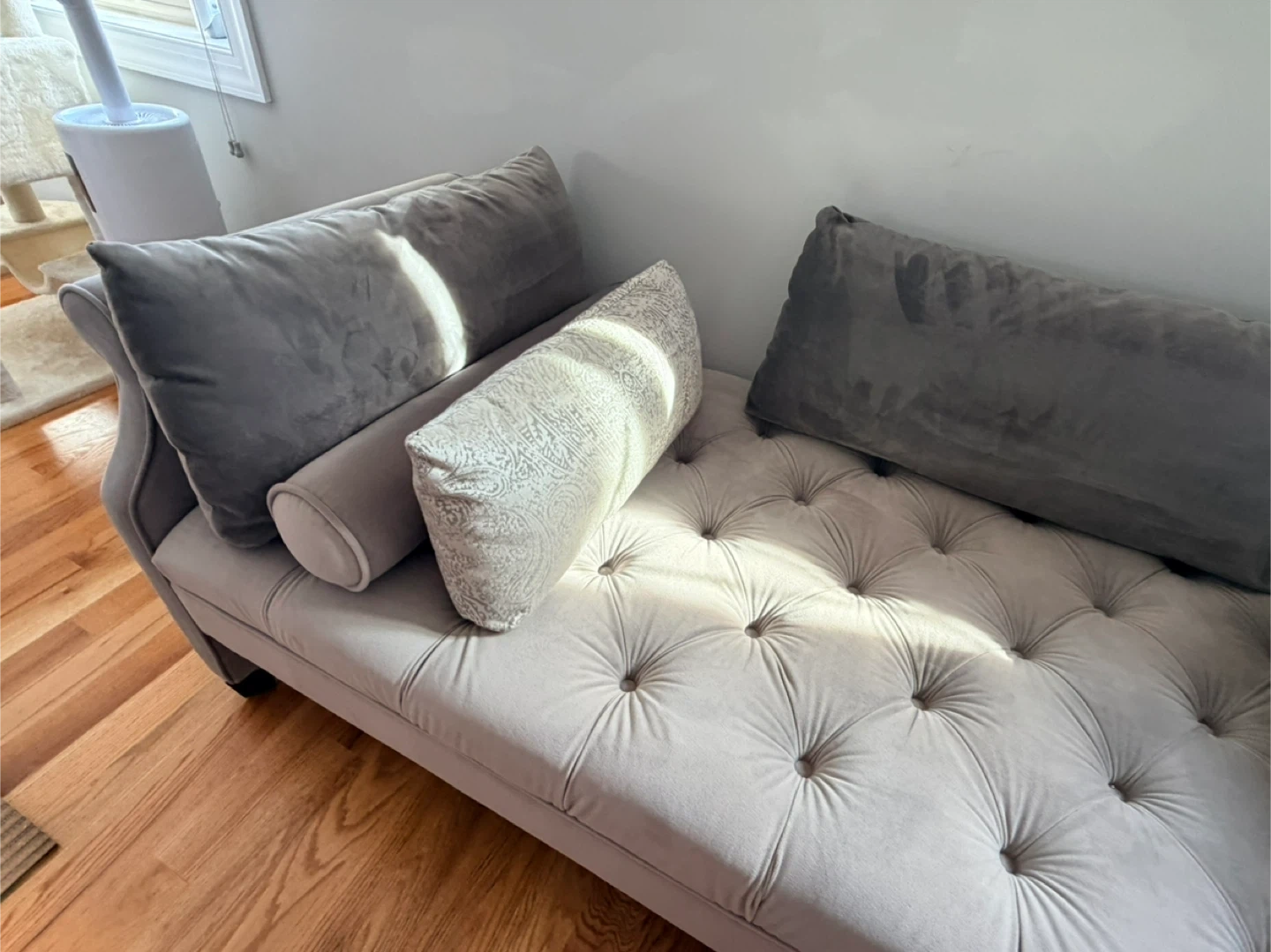 Elegant tufted chaise lounge with multiple decorative pillows. Upholstered in a soft, neutral fabric. Offers a stylish seating or lounging option for your living space.