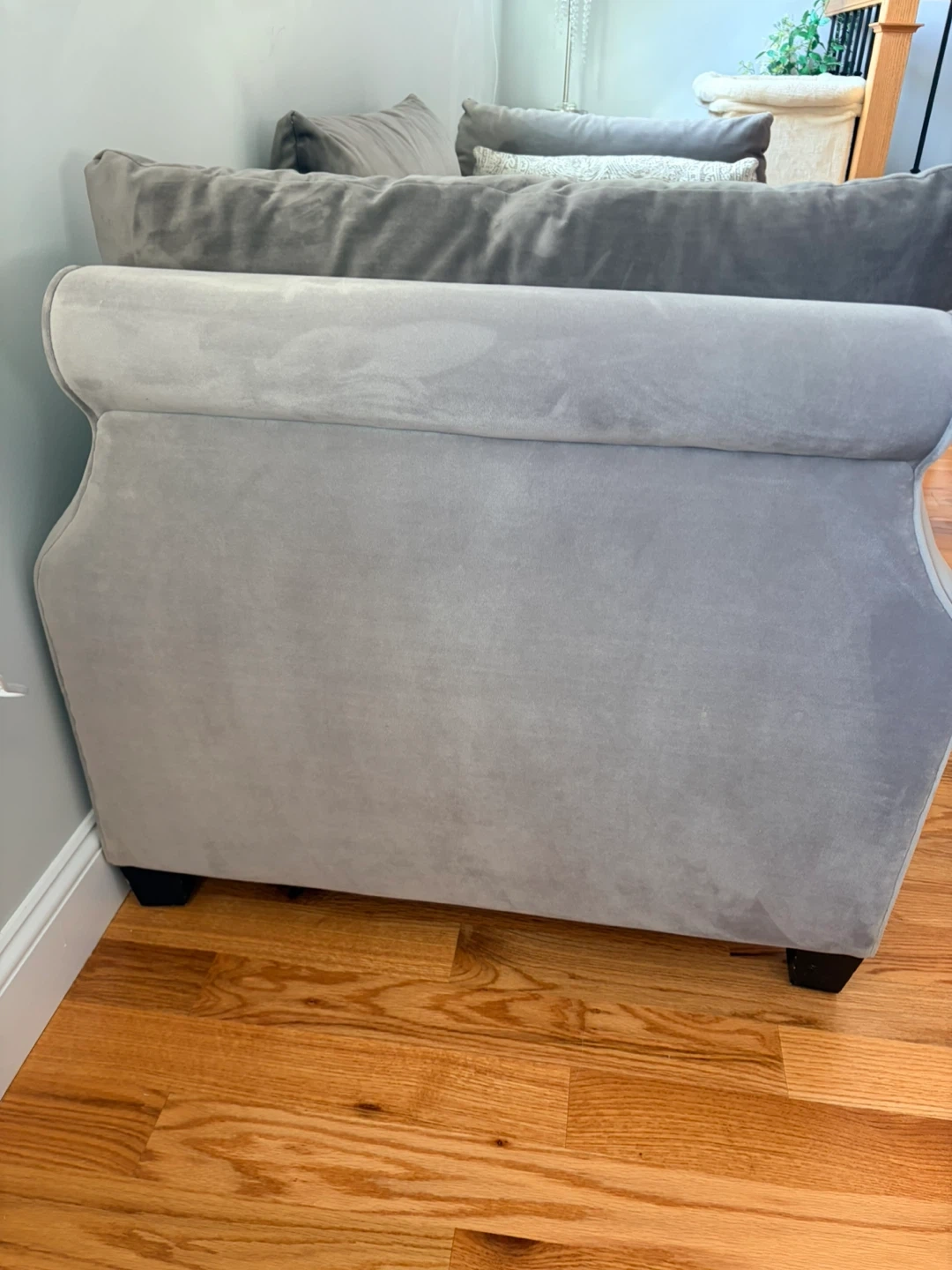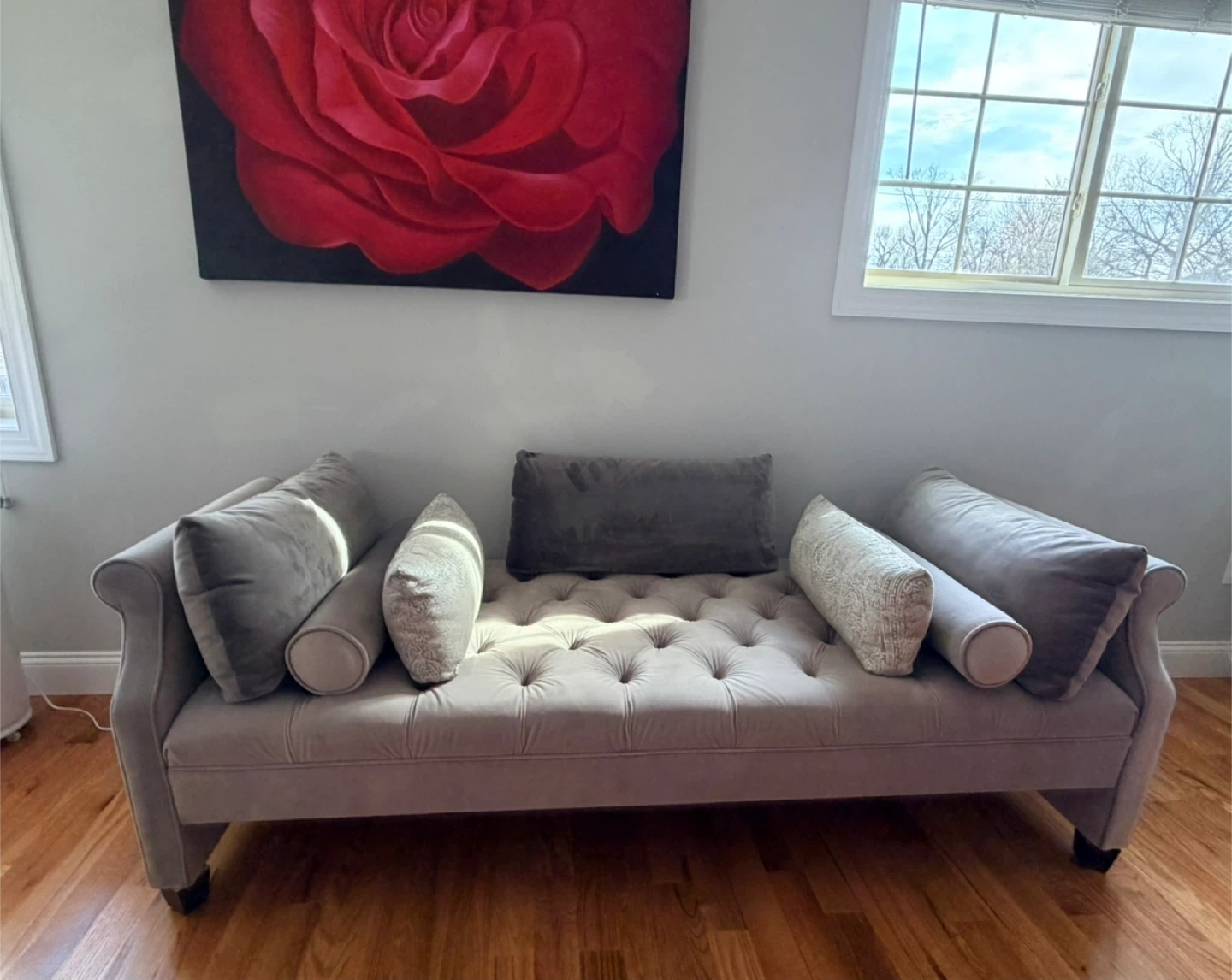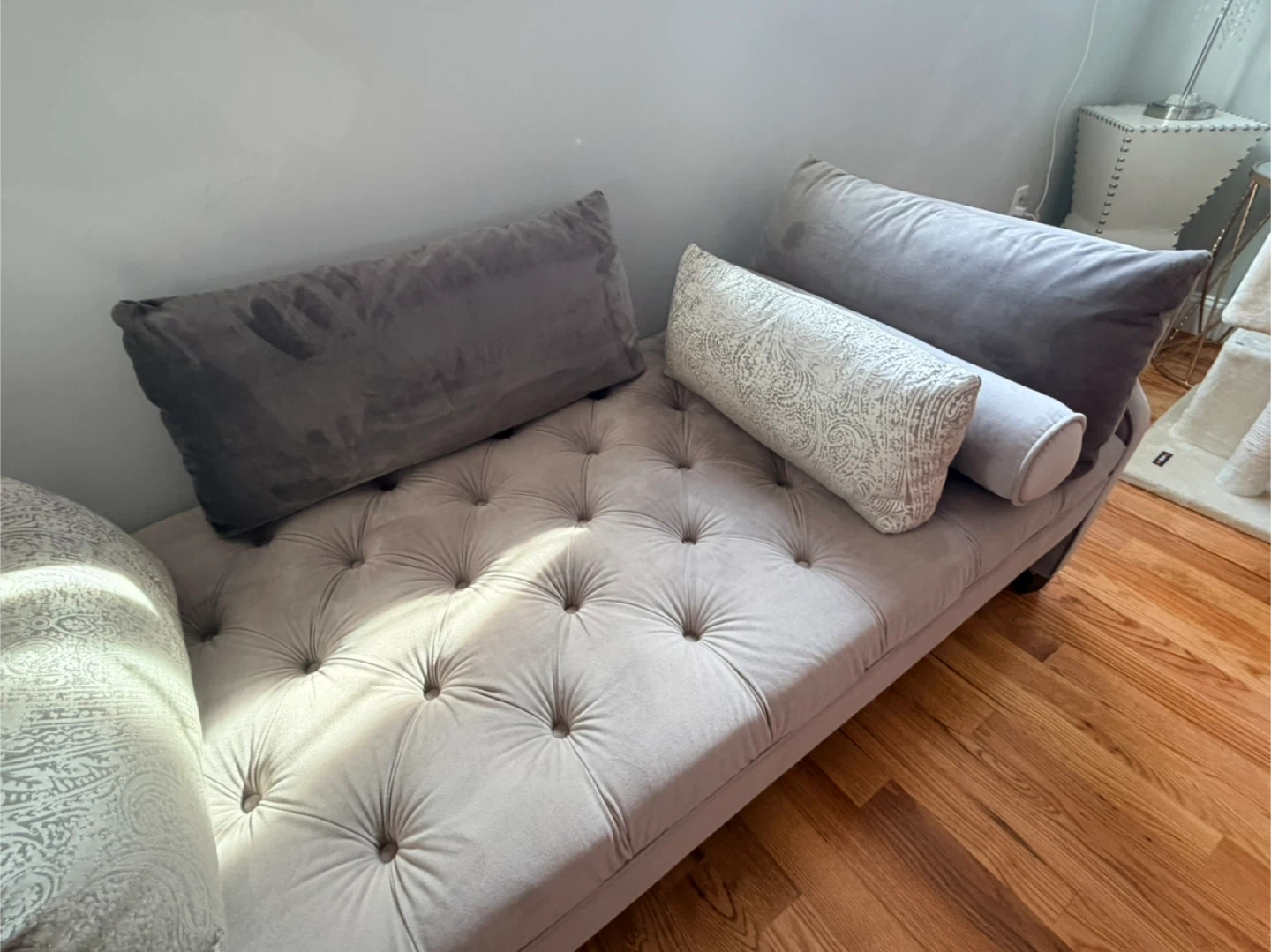 Elegant tufted chaise lounge with multiple decorative pillows. Upholstered in a soft, neutral fabric. Offers a stylish seating or lounging option for your living space.