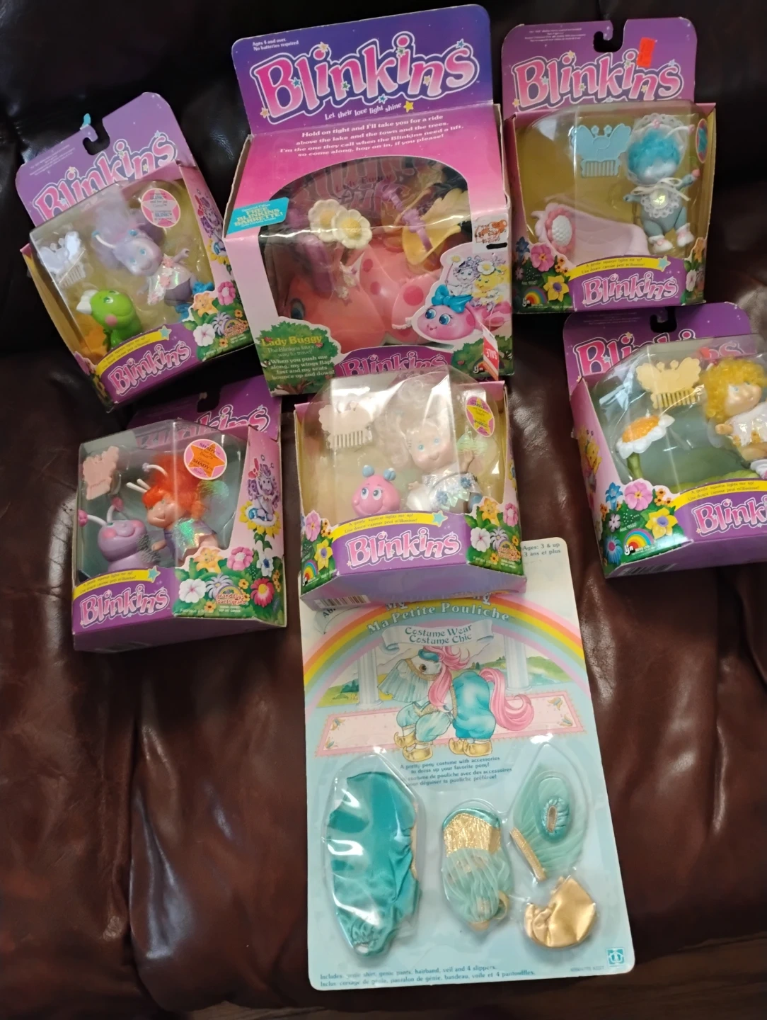 This bundle includes several Blinkins toys, including the Lady Buggy and Ma Petite Pouliche costume set. These collectible dolls are designed for imaginative play and are suitable for ages 3 and up. Some are new in box.