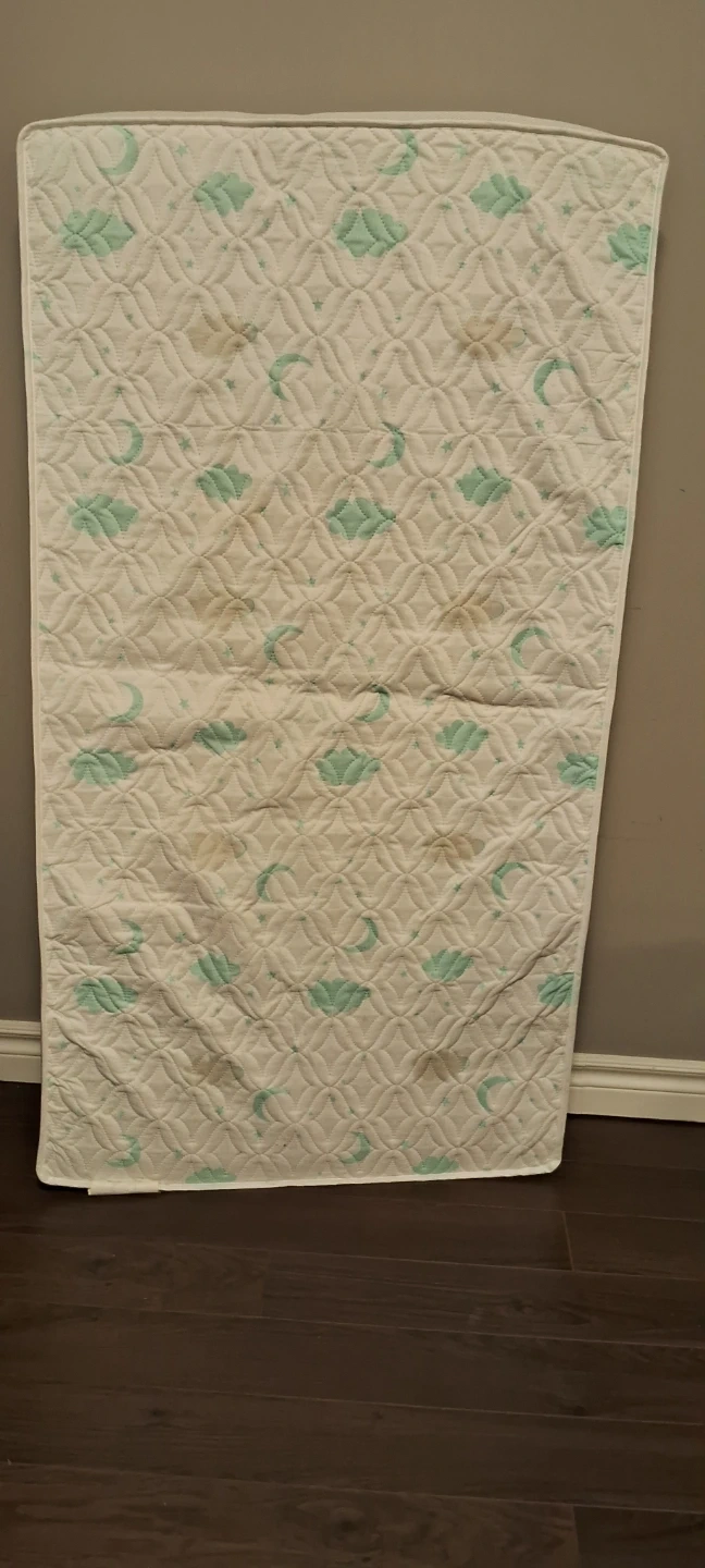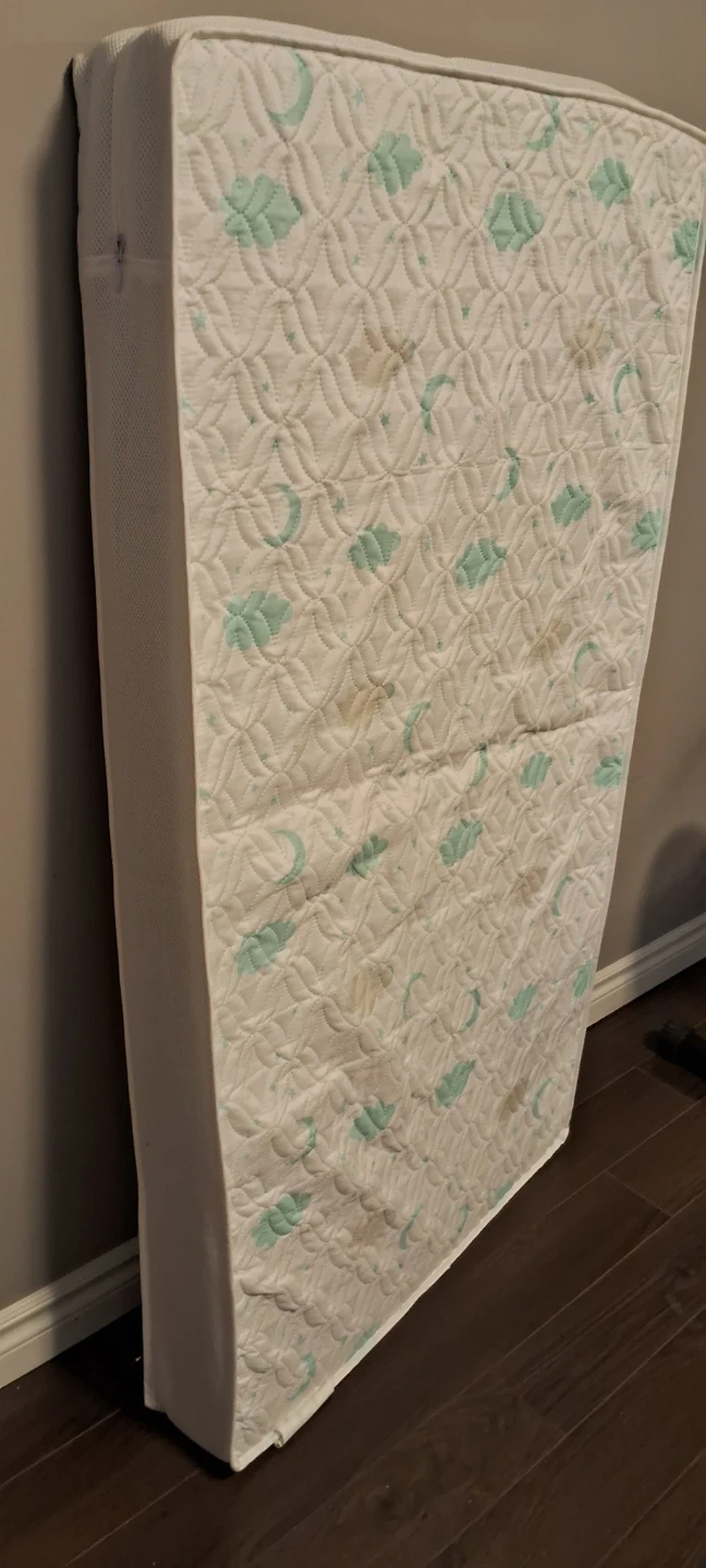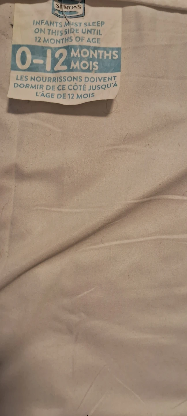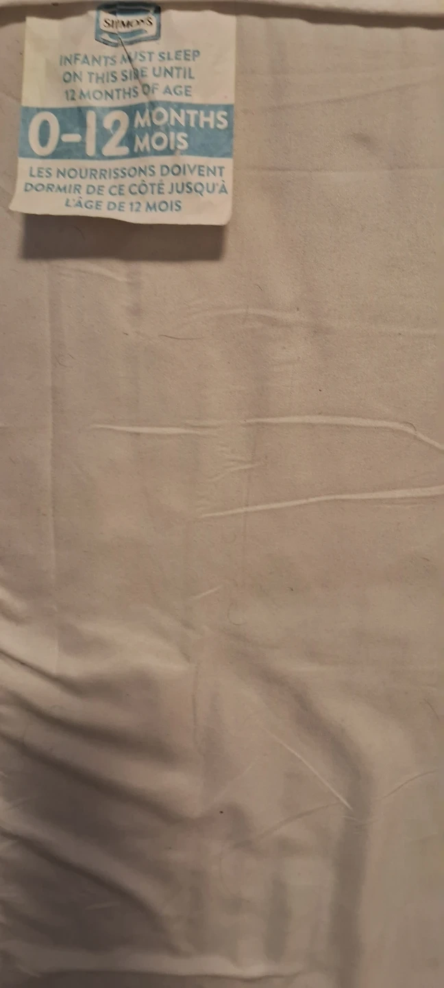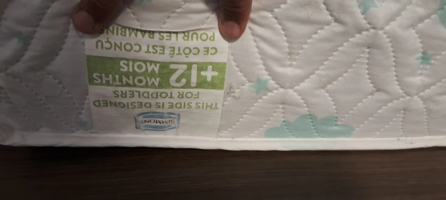Simmons toddler mattress with a cloud and moon pattern. This side is designed for toddlers and is meant for children 12 months and older. The other side is for infants 0-12 months.