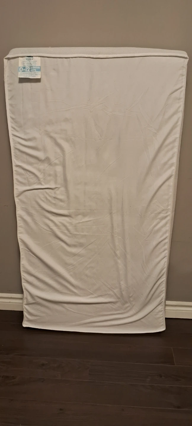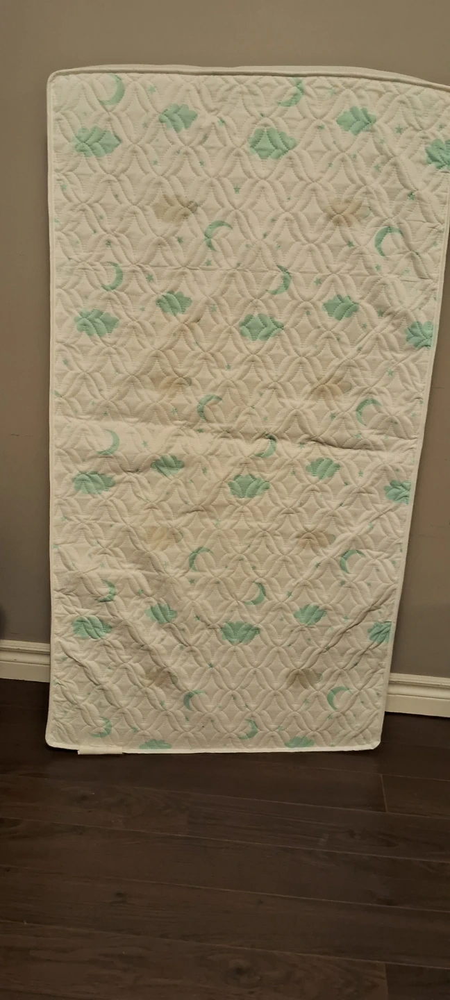 Simmons toddler mattress with a cloud and moon pattern. This side is designed for toddlers and is meant for children 12 months and older. The other side is for infants 0-12 months.