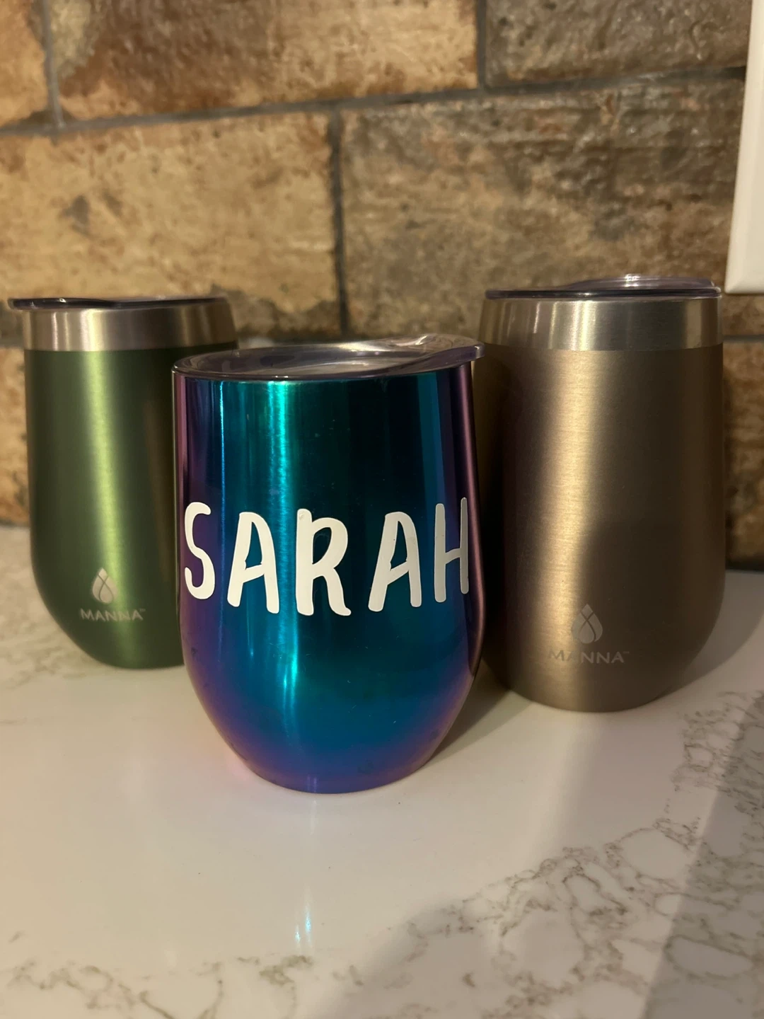This set includes tumblers, each holding 12oz or 350ml. One tumbler features 'Sarah' personalization in a vibrant teal and blue iridescent finish. The other two are in olive green and brushed gold.