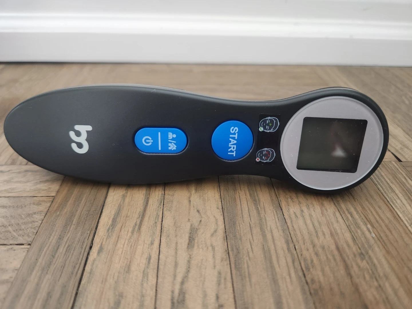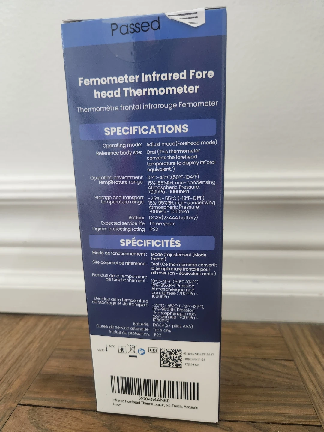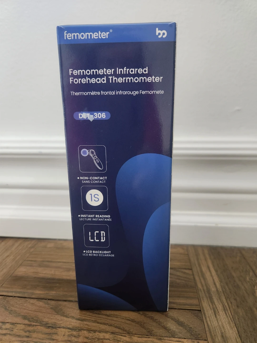 This is a non-contact infrared forehead thermometer. It provides instant readings on an LCD screen. Comes with 2 AAA batteries.