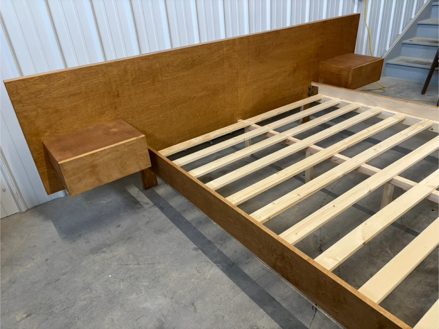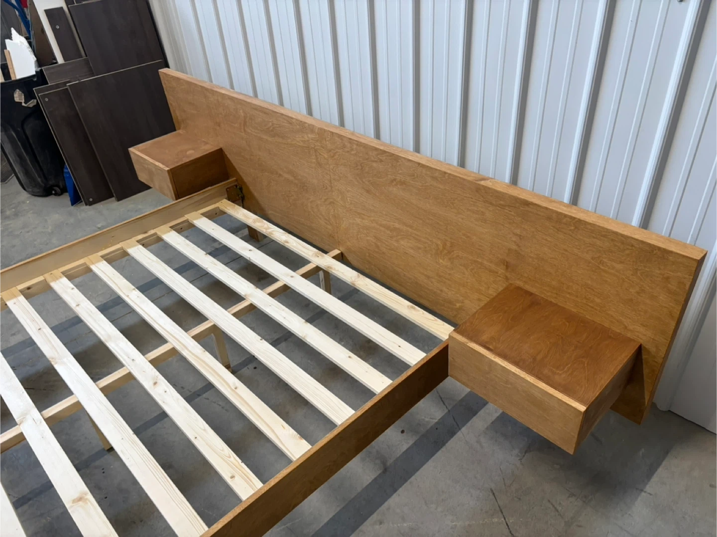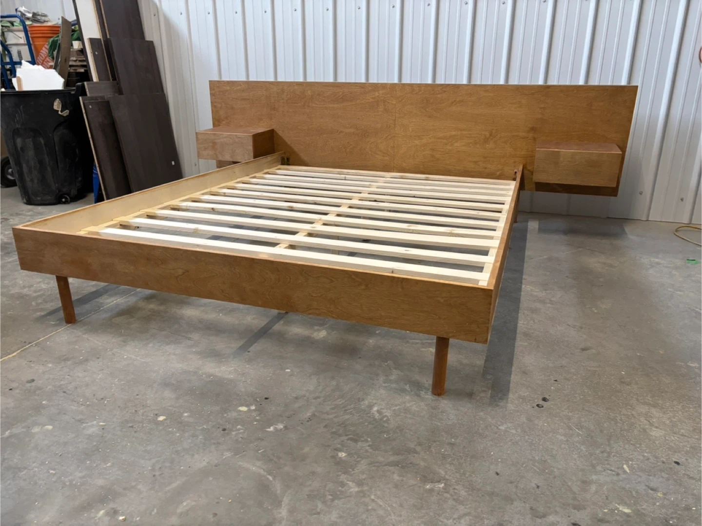 Brand new queen sized mid century style low profile bed frame. This bed frame feature a low profile modern design with an oversized headboard with integrated nightstands. The bed frame features birch veneers finished in a chestnut colour. No box spring required. It’s brand new and in great condition.