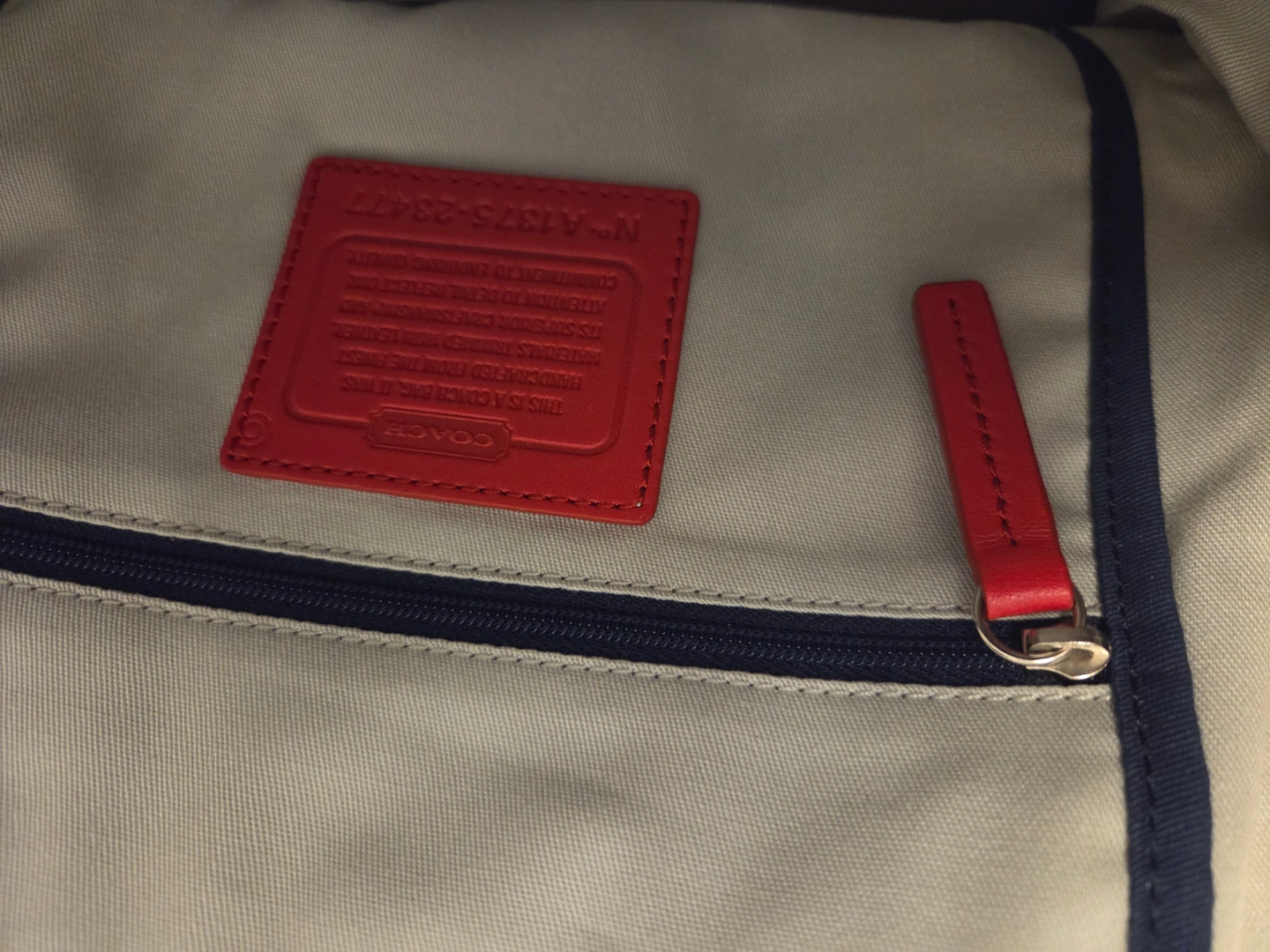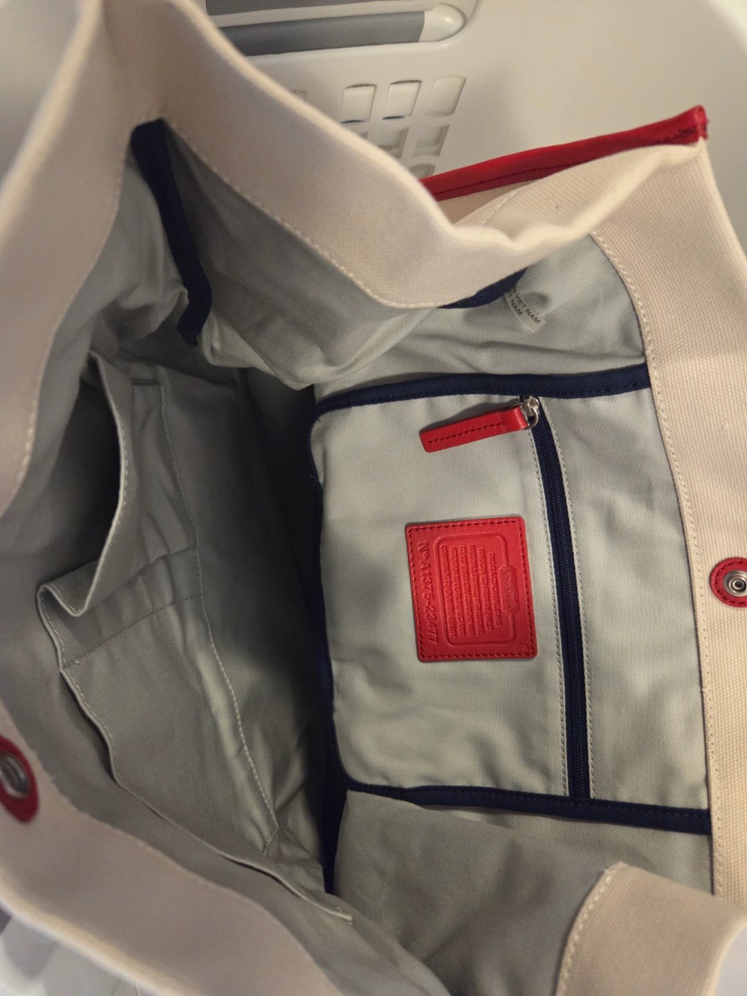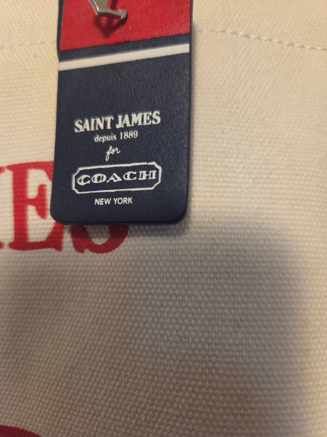 Large canvas tote bag. Cream coloured base with navy blue stripes and red accents. Leather handles and zipper closure. Interior pockets. Saint James for Coach collaboration. Brand new never used authentic coach canvas tote and dust bag.