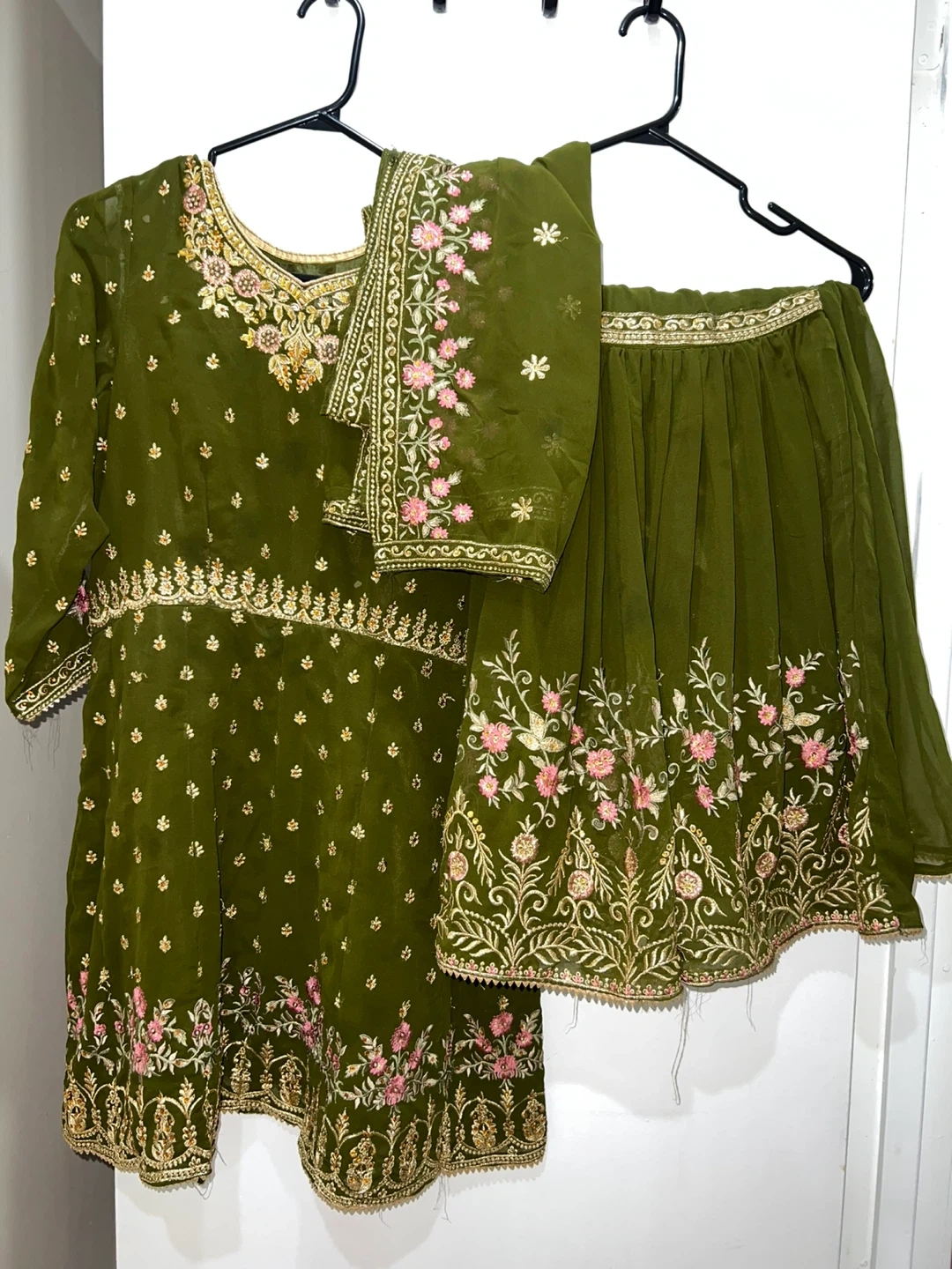 This is a beautiful olive green three-piece outfit featuring intricate embroidery with pink and gold floral motifs. The set includes a kurti, a skirt, and a dupatta. The fabric appears to be a lightweight material like chiffon or georgette, perfect for warmer weather or events.