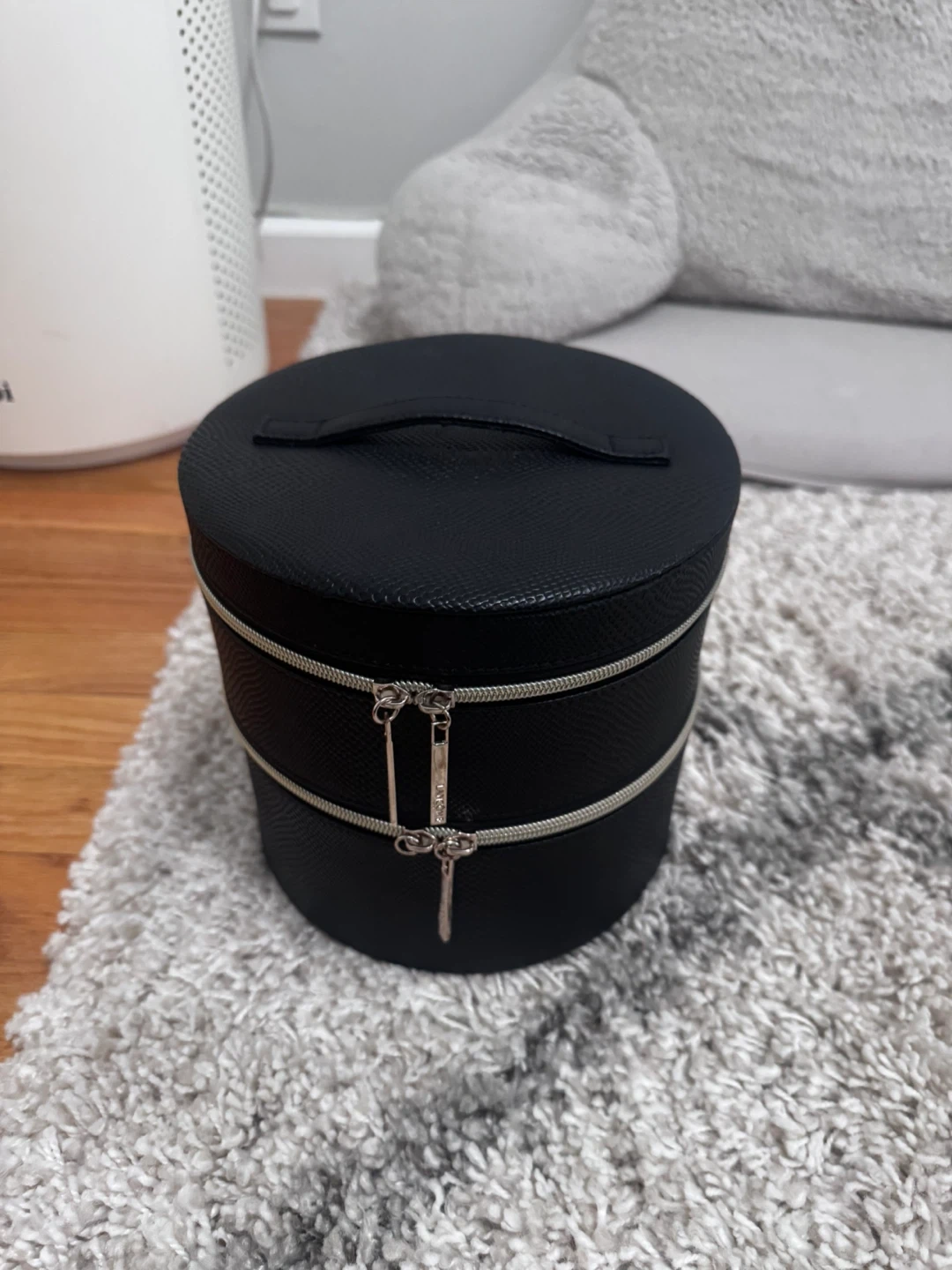 Black round case with a bright fuchsia interior. Features a top handle and a zippered closure. Includes a convenient mirror inside the lid. Perfect for organizing your jewelry and makeup on the go!