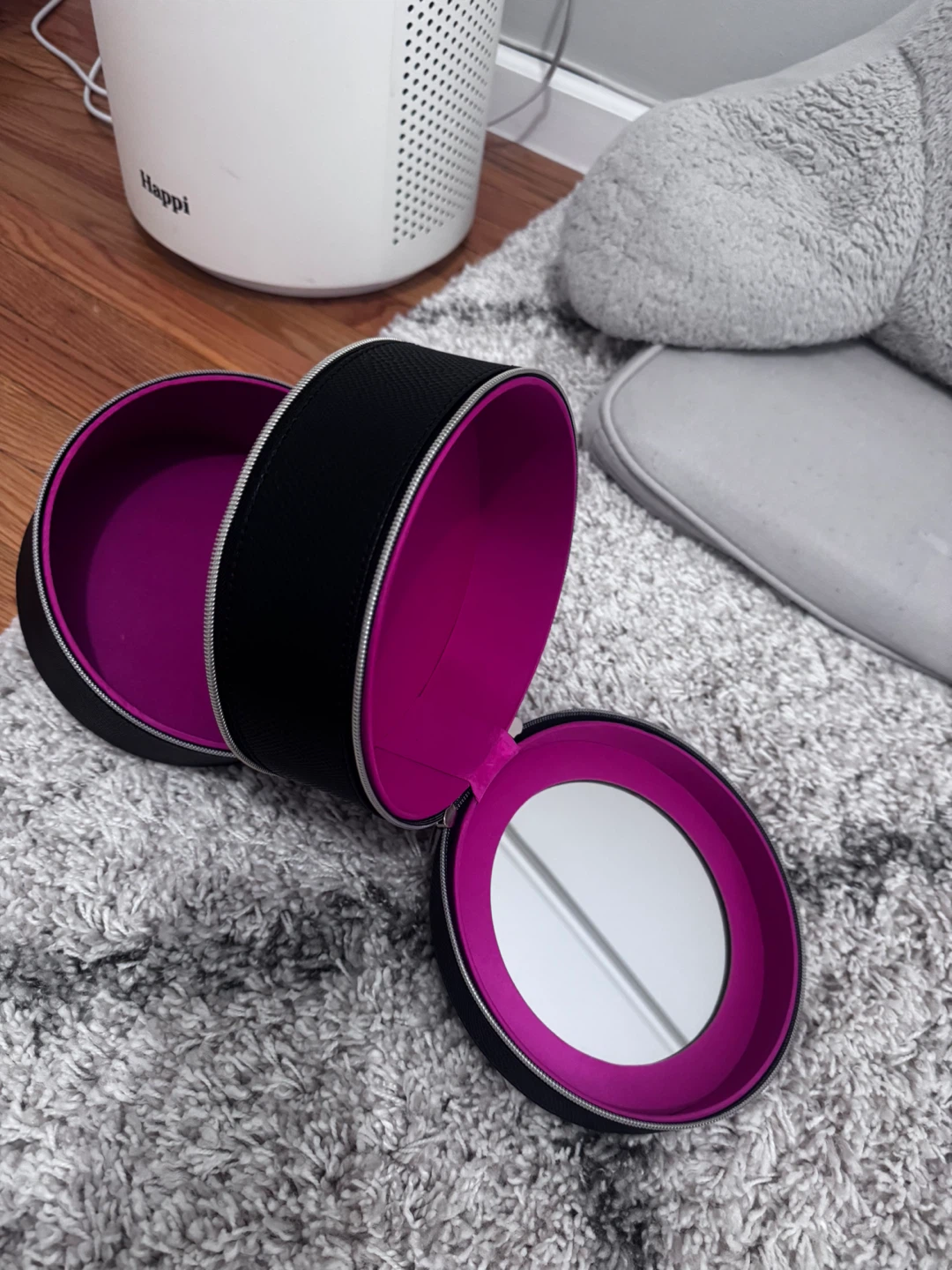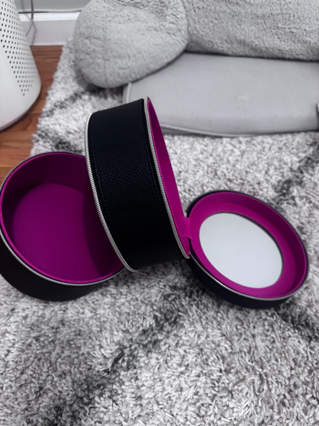 Black round case with a bright fuchsia interior. Features a top handle and a zippered closure. Includes a convenient mirror inside the lid. Perfect for organizing your jewelry and makeup on the go!