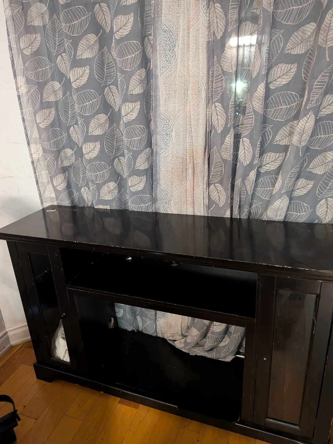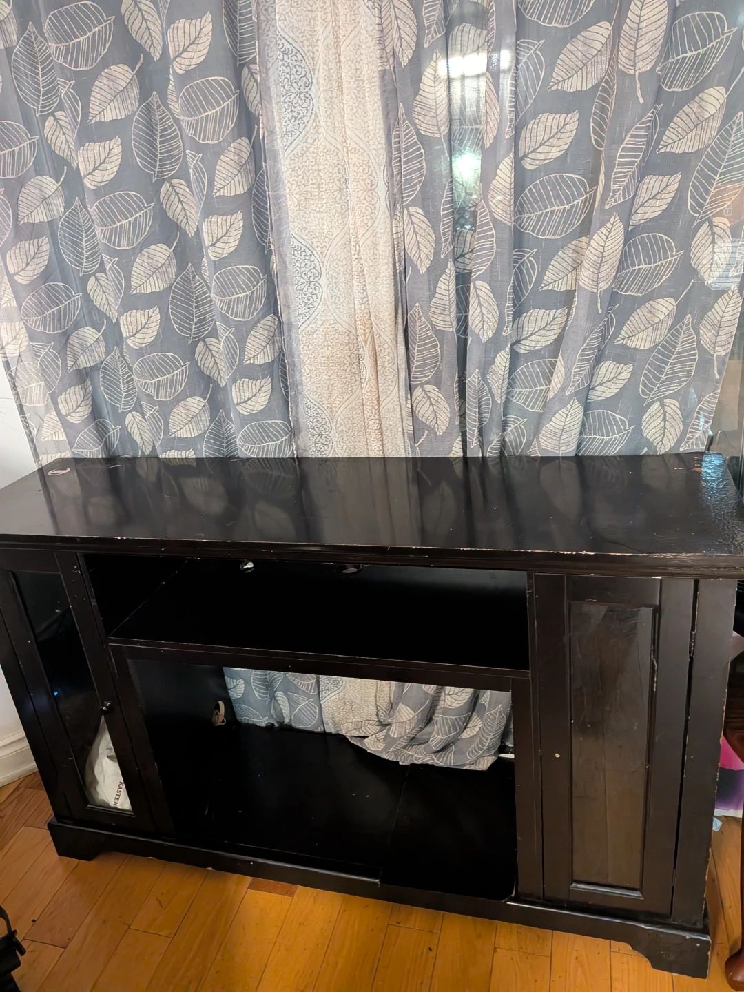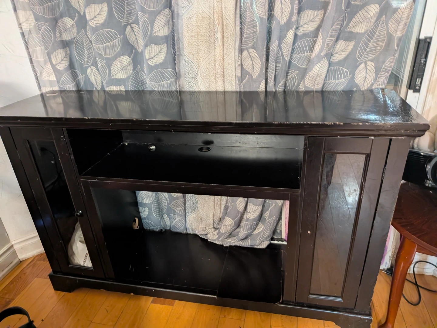 This dark wood media console offers ample storage space. It features a central open shelf and two side cabinets with glass doors. Its classic design fits well in most living rooms.