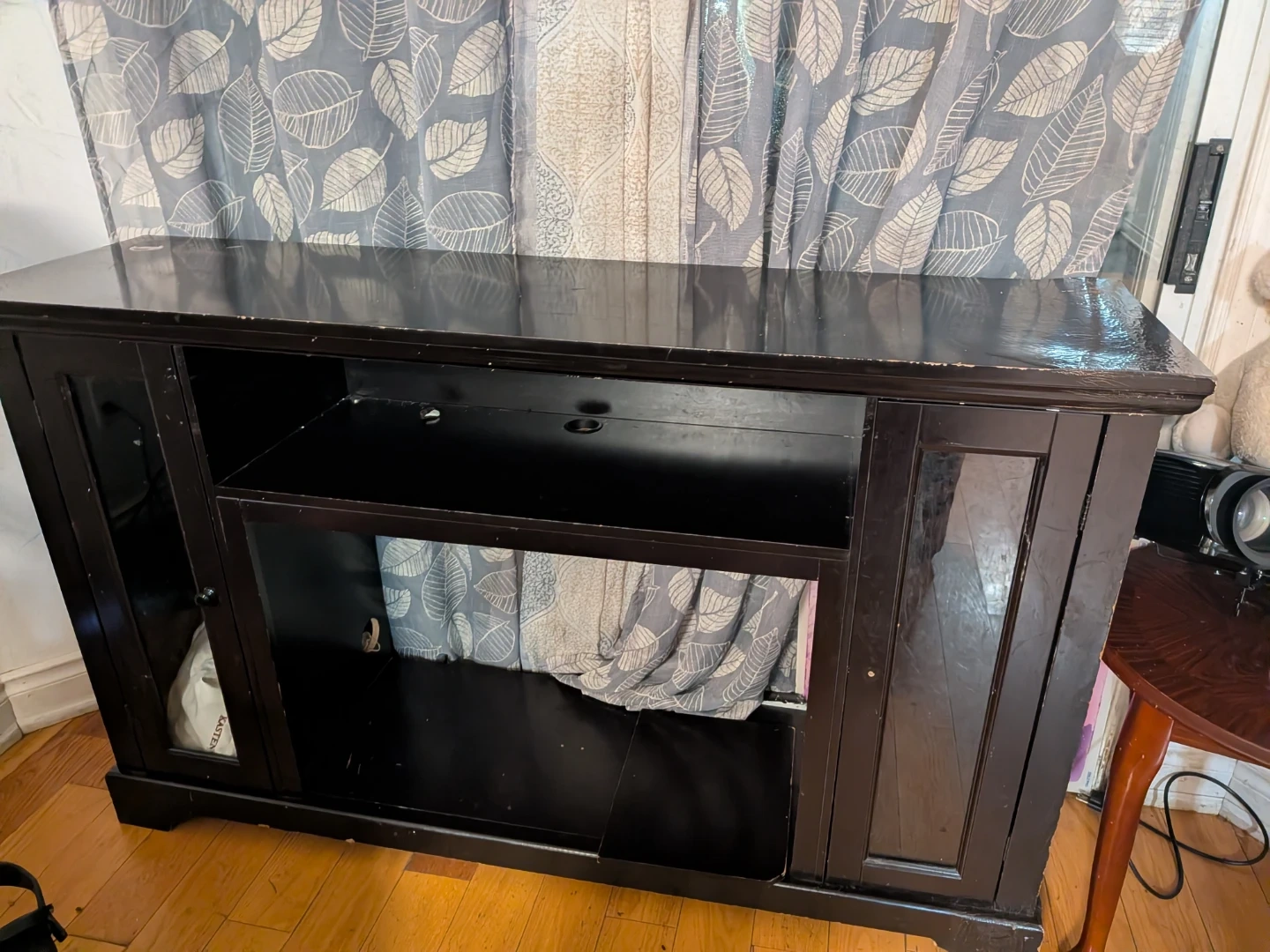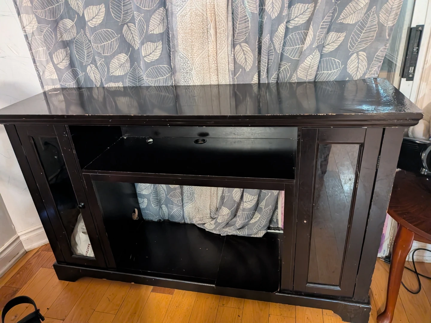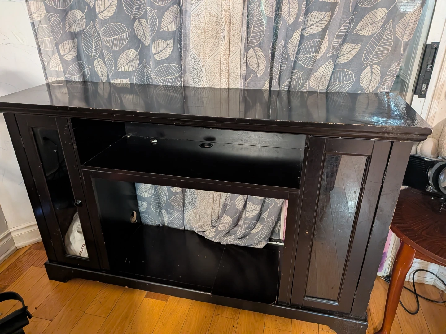 This dark wood media console offers ample storage space. It features a central open shelf and two side cabinets with glass doors. Its classic design fits well in most living rooms.