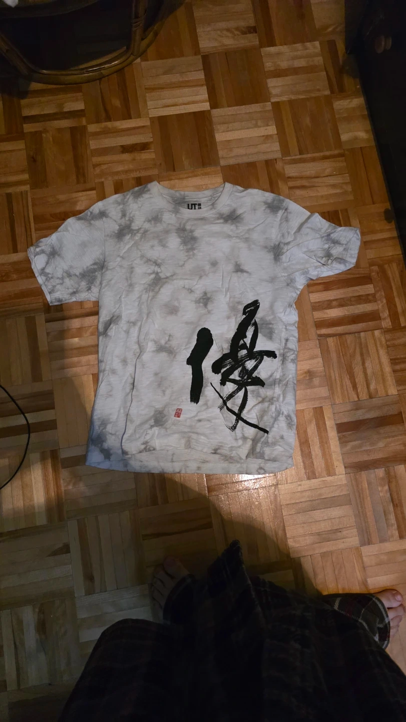 This Uniqlo UT t-shirt features a cool tie-dye pattern with bold Japanese calligraphy graphics. It's a comfortable and stylish piece for everyday wear. 100% cotton material.
