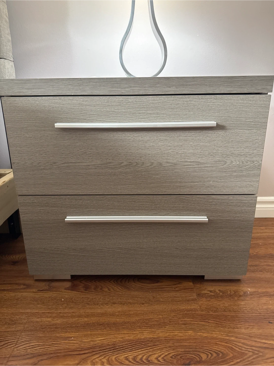 This is a two-drawer nightstand with a wood-grain finish and silver handles and dresser. It's a great addition to any bedroom for storing essentials.