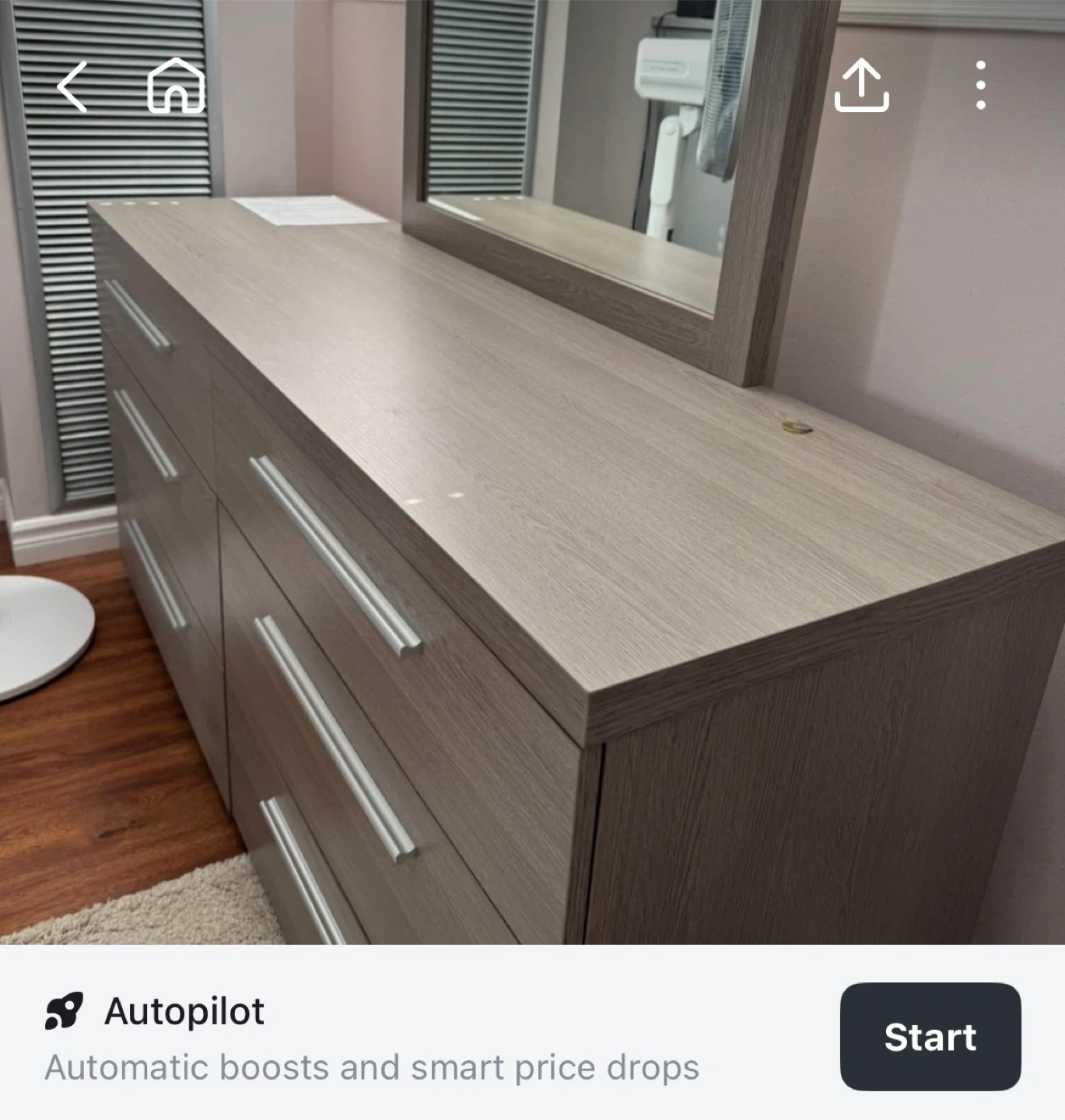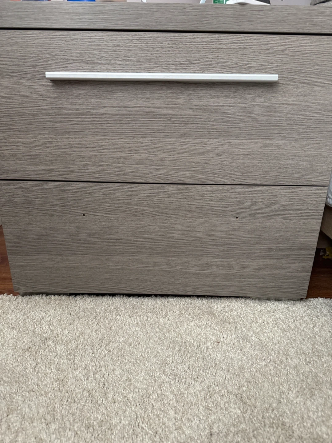 This is a two-drawer nightstand with a wood-grain finish and silver handles and dresser. It's a great addition to any bedroom for storing essentials.