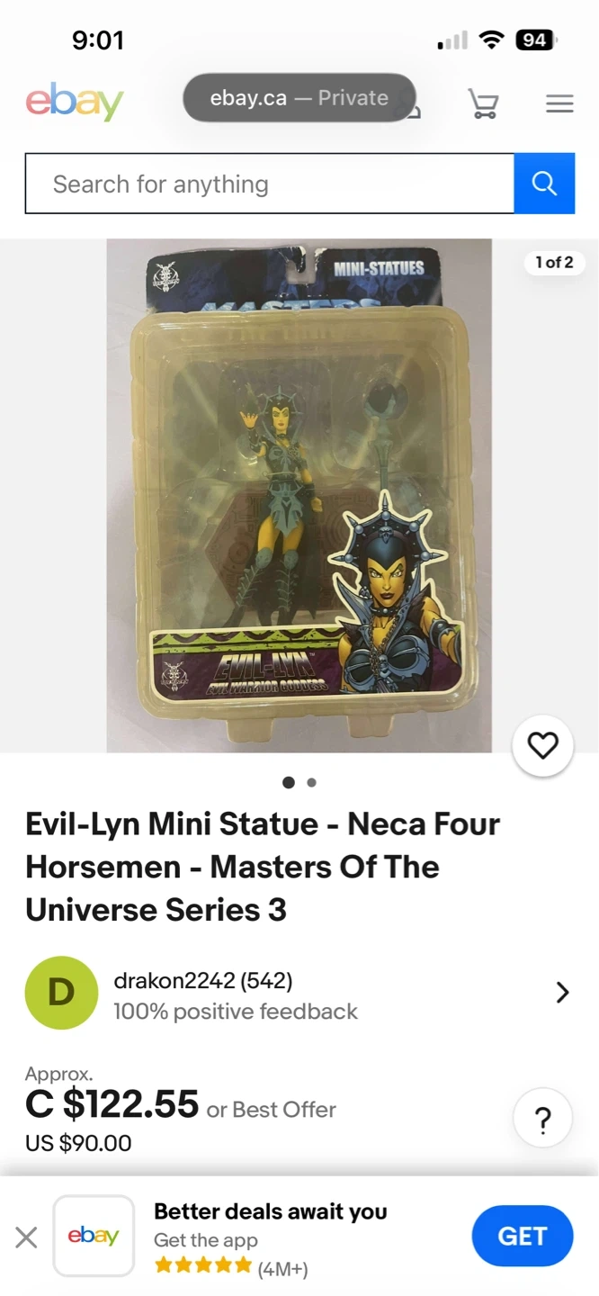 This is the Evil-Lyn mini statue from Neca's Masters of the Universe Series 3. It's a collector's item for fans of the franchise. The packaging shows some wear but the statue appears to be in good condition.