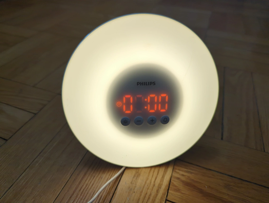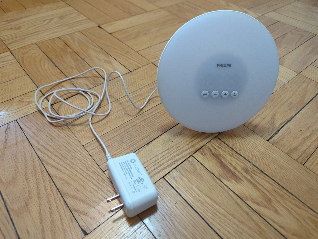 Used Philips wake-up light alarm clock. Features a sunrise simulation, digital clock, and various sound options. Includes power adapter. Great for gentle mornings.