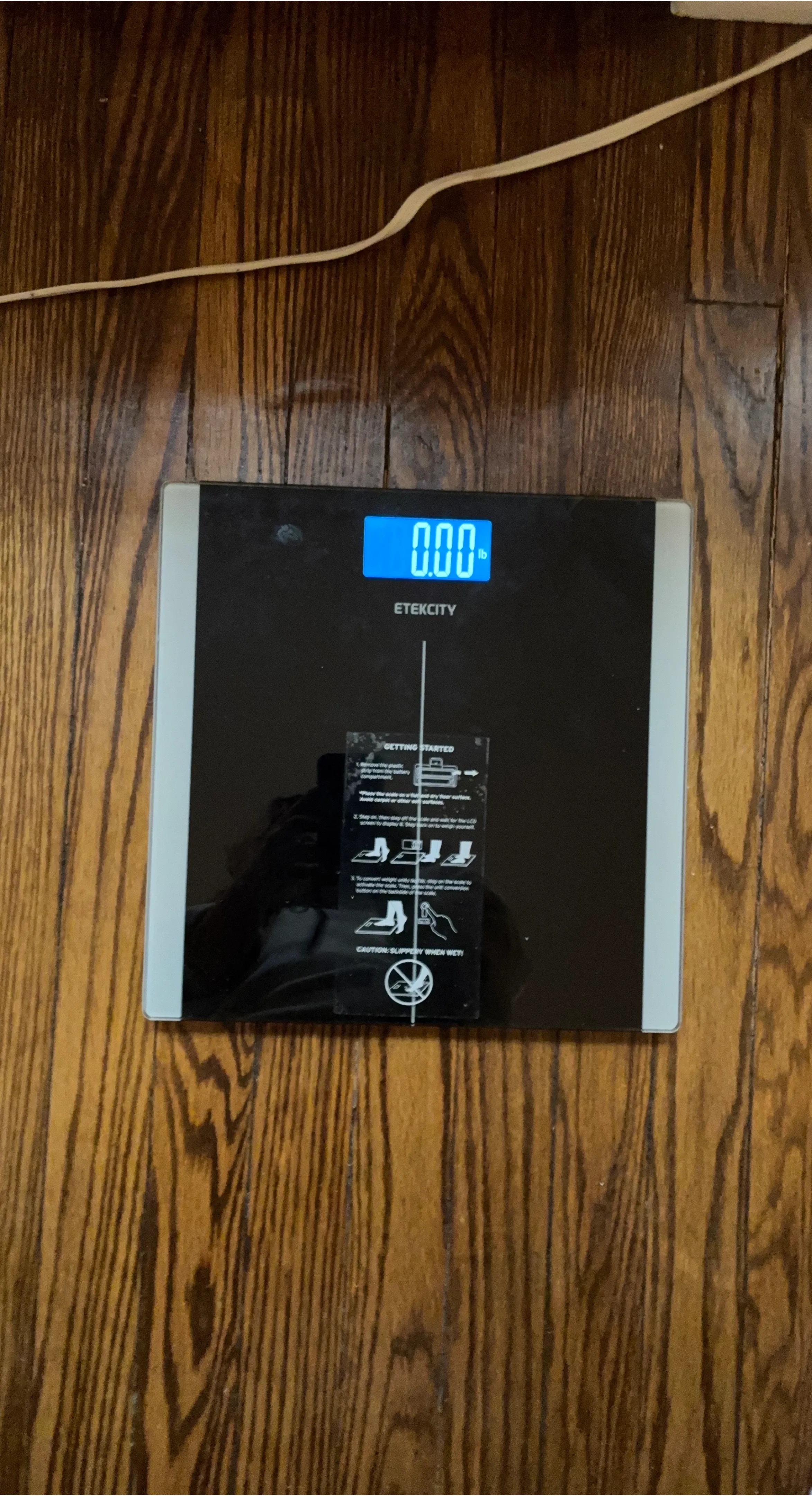 ETEKCITY digital bathroom scale. Black glass construction with a blue LCD display. Battery compartment is accessible for setup. It's designed for dry floor surfaces.