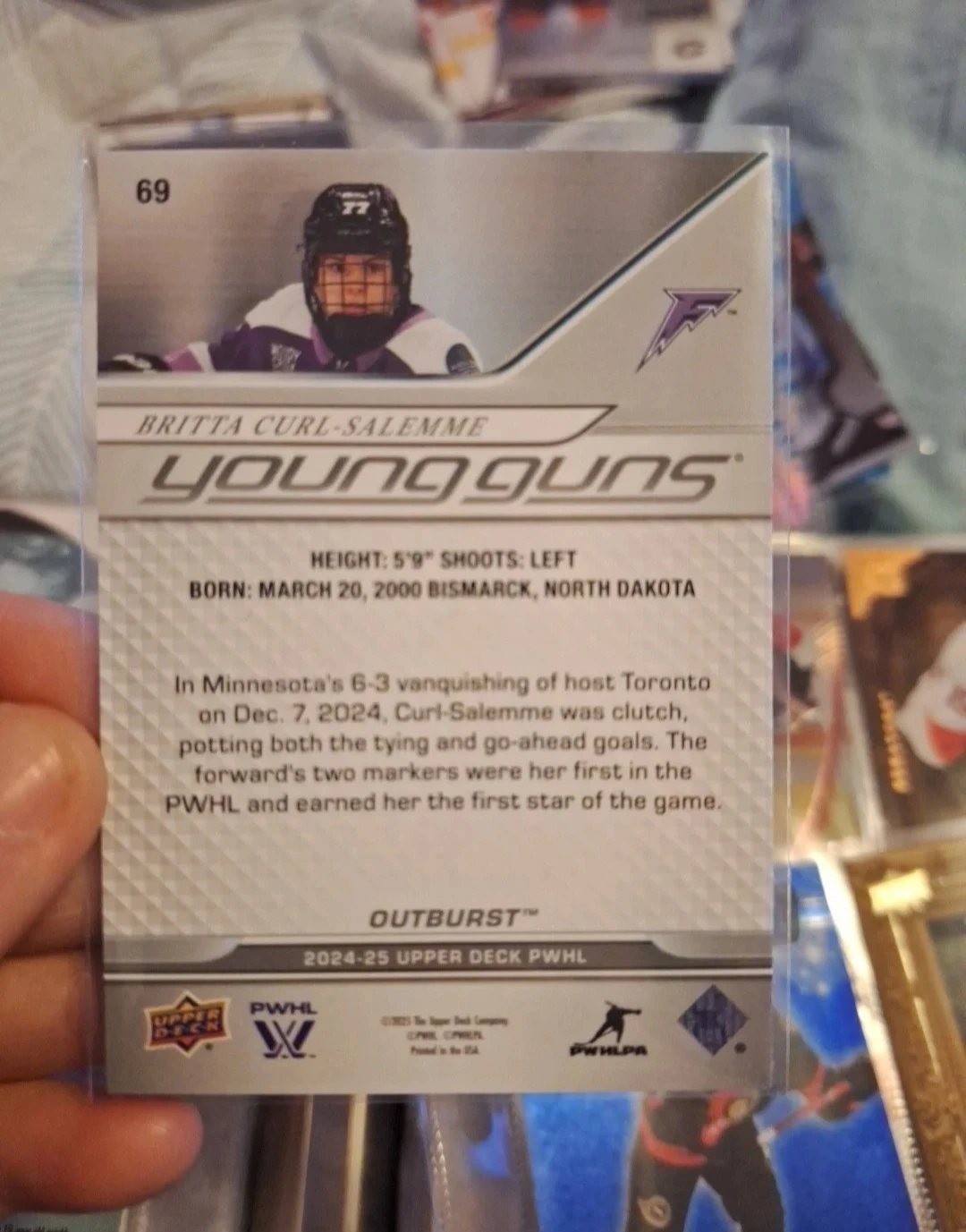 This is a 2024-25 Upper Deck PWHL hockey card featuring Britta Curl-Salemme. It's a Young Guns rookie card. Her birthdate is March 20, 2000.