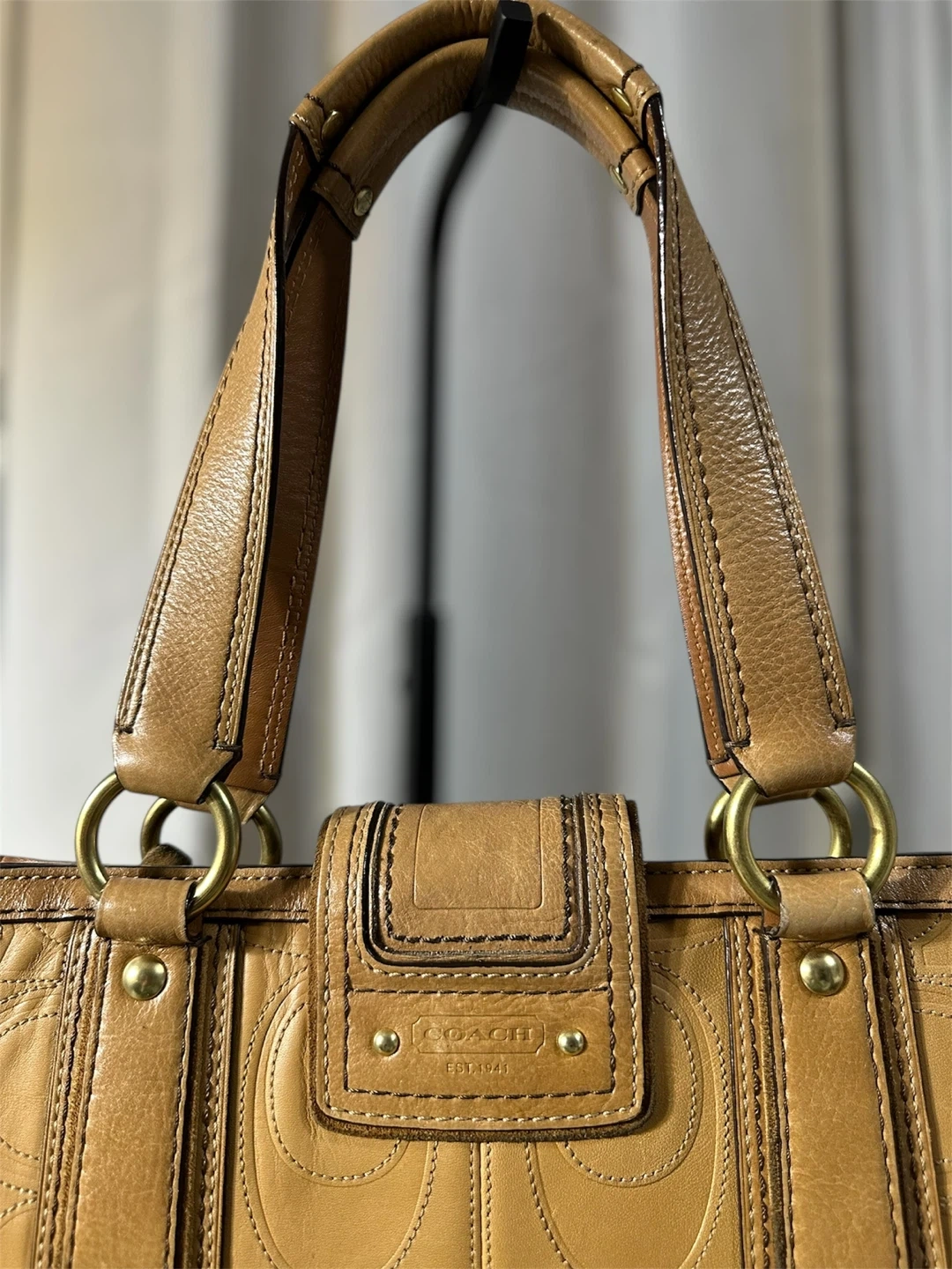 Vintage Coach 11330 Hamptons turnlock shoulder bag in embossed signature tan leather with brass hardware. In a pre loved good condition. Just a small lipstick stain inside of the pocket. Shown on the photo.