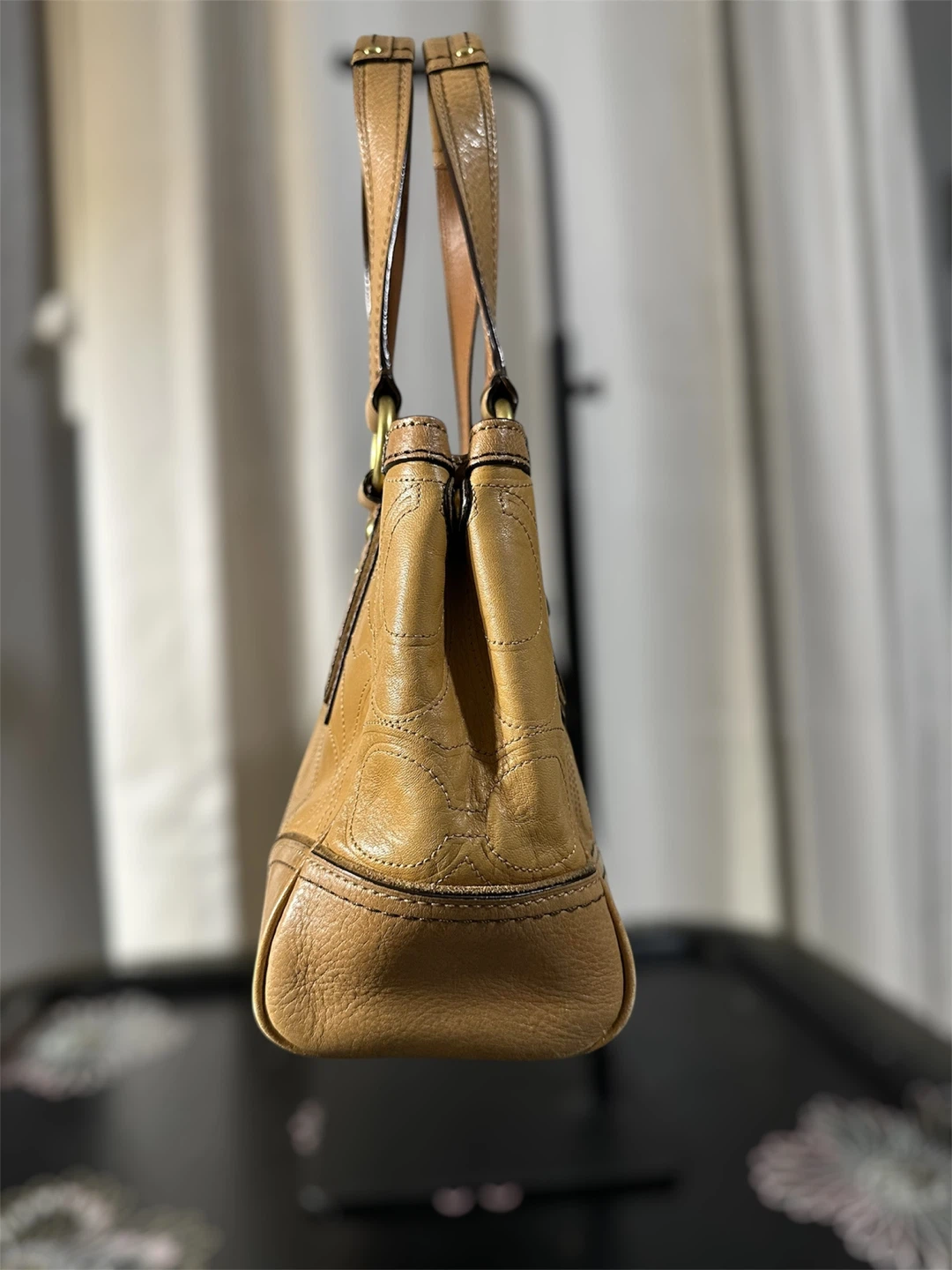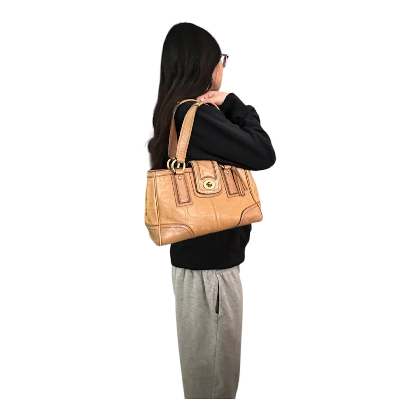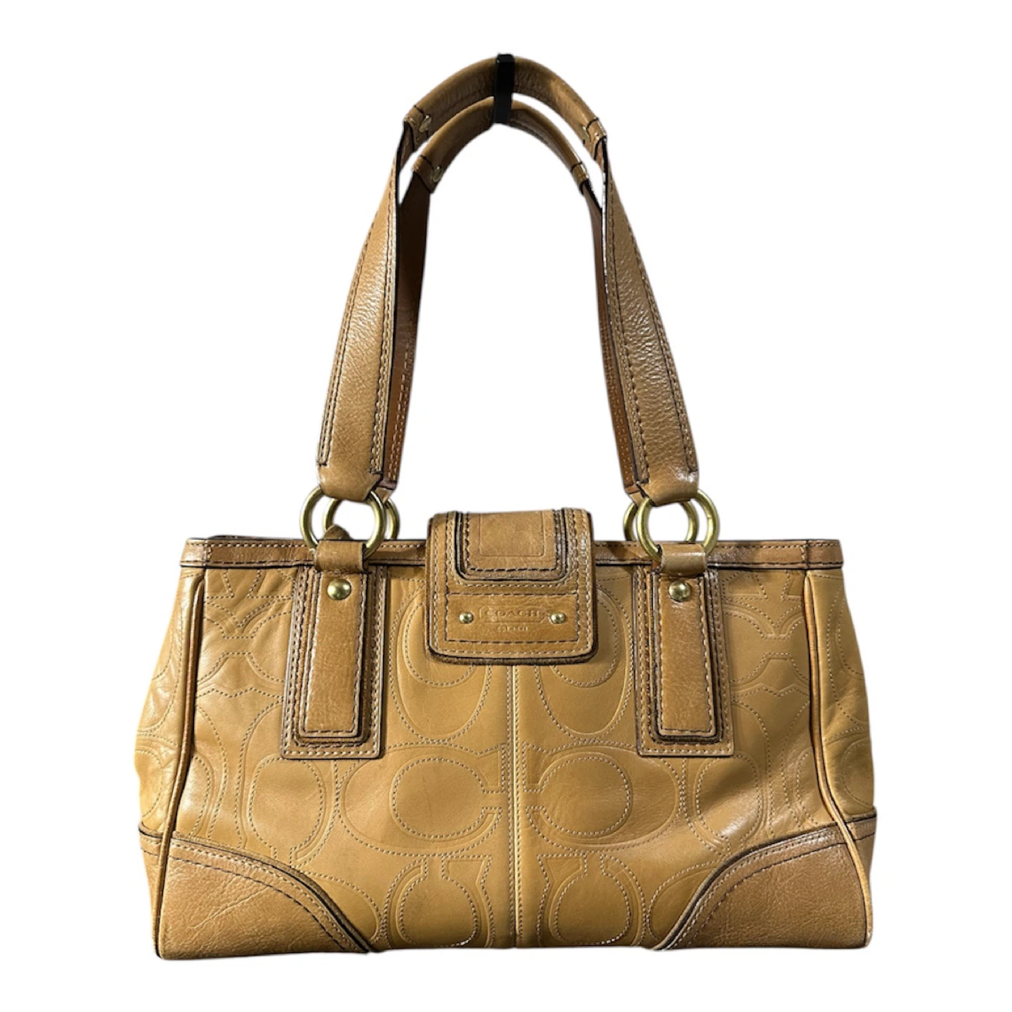 Vintage Coach 11330 Hamptons turnlock shoulder bag in embossed signature tan leather with brass hardware. In a pre loved good condition. Just a small lipstick stain inside of the pocket. Shown on the photo.
