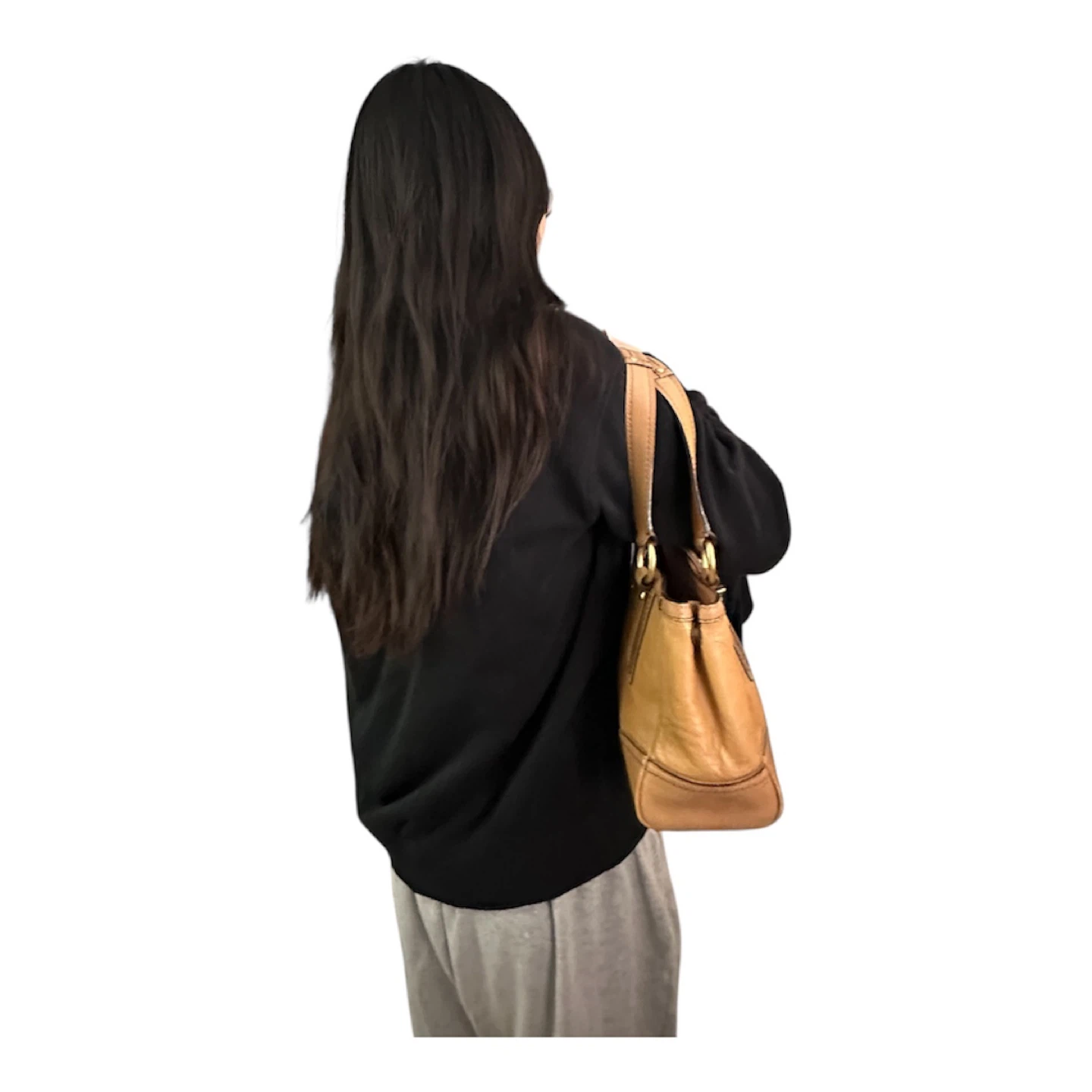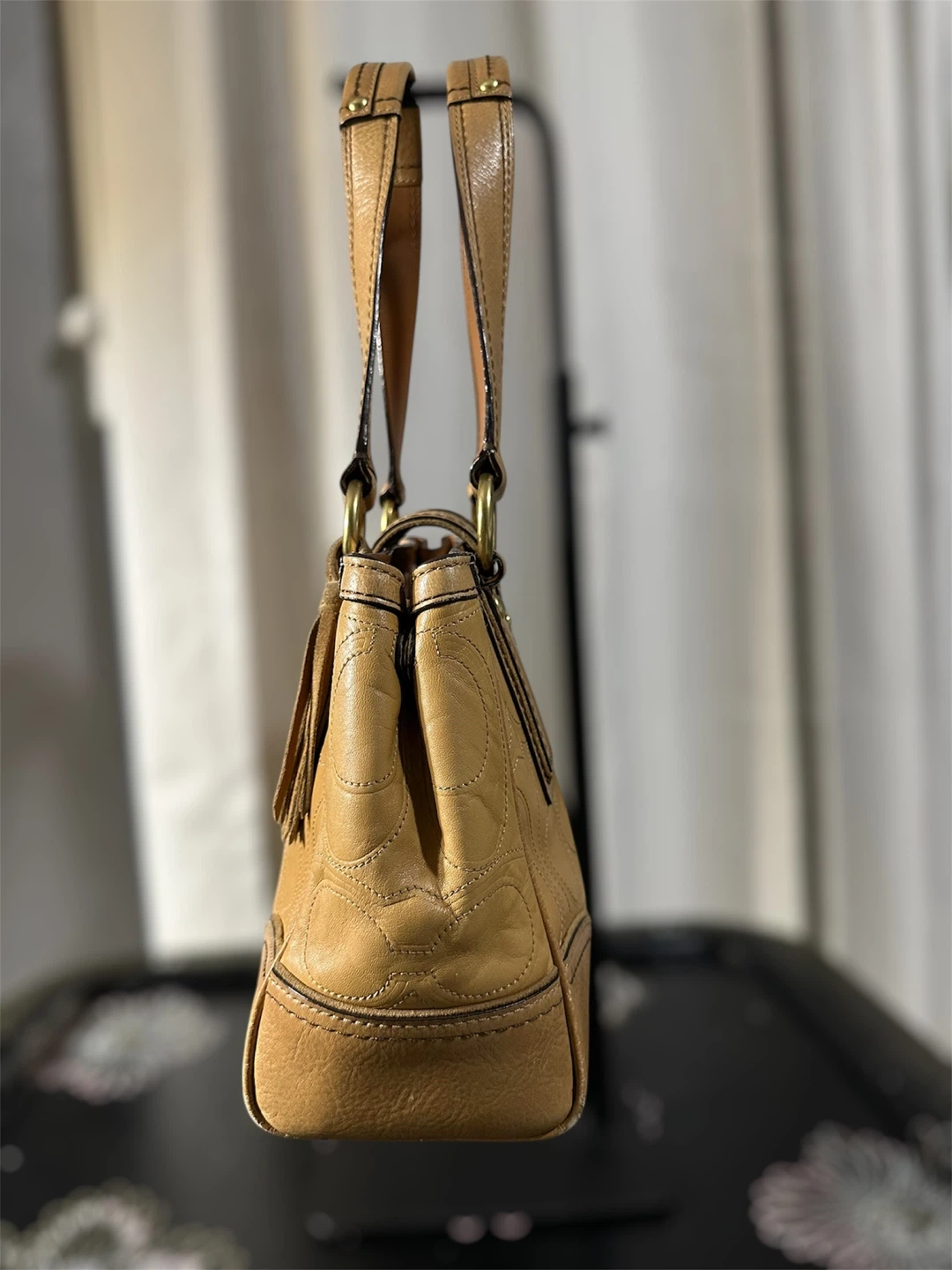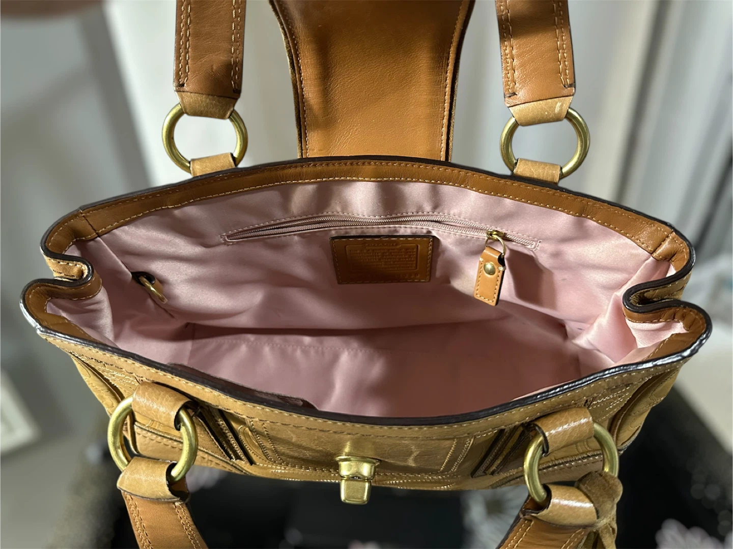 Vintage Coach 11330 Hamptons turnlock shoulder bag in embossed signature tan leather with brass hardware. In a pre loved good condition. Just a small lipstick stain inside of the pocket. Shown on the photo.