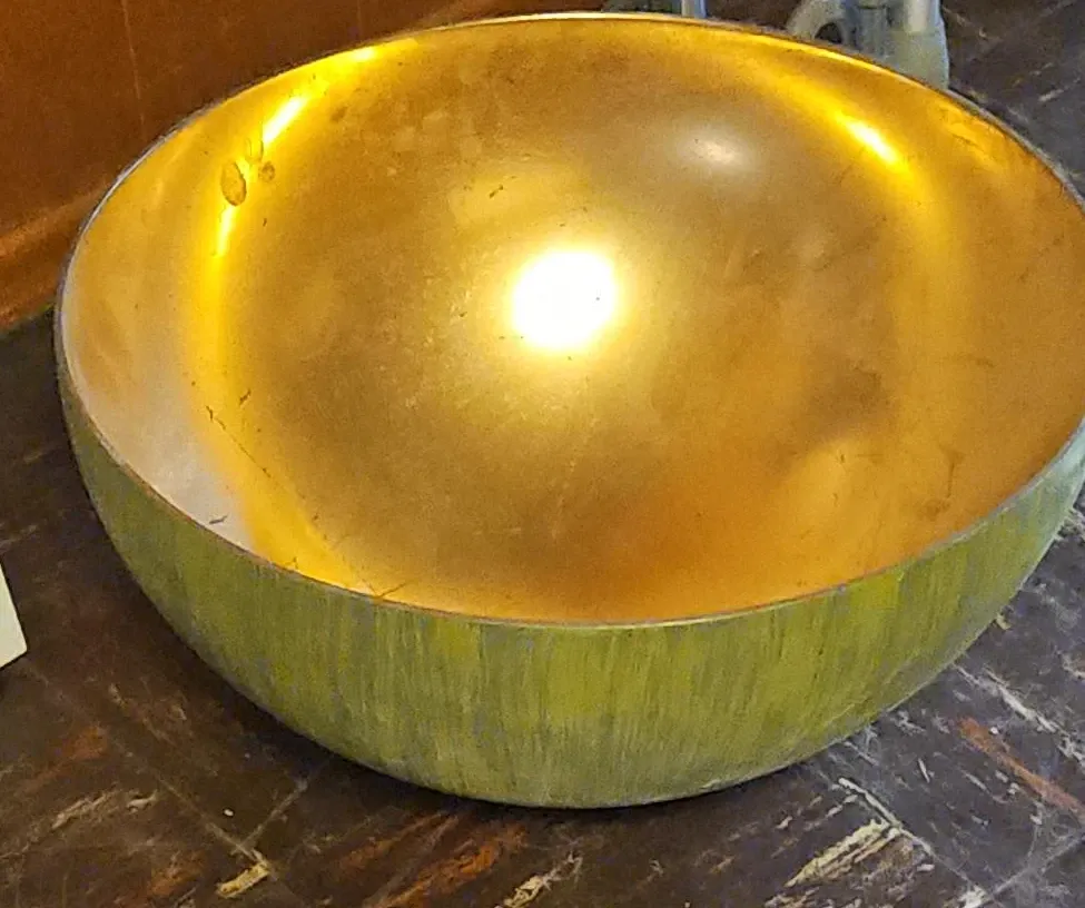 This decorative bowl features a bright gold interior and a textured green exterior. It's a substantial piece that could be used for display or as a serving bowl. This item is not food-grade.