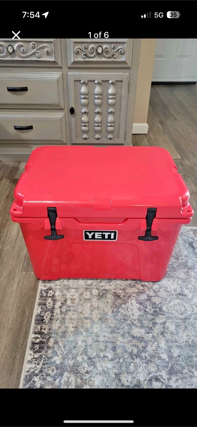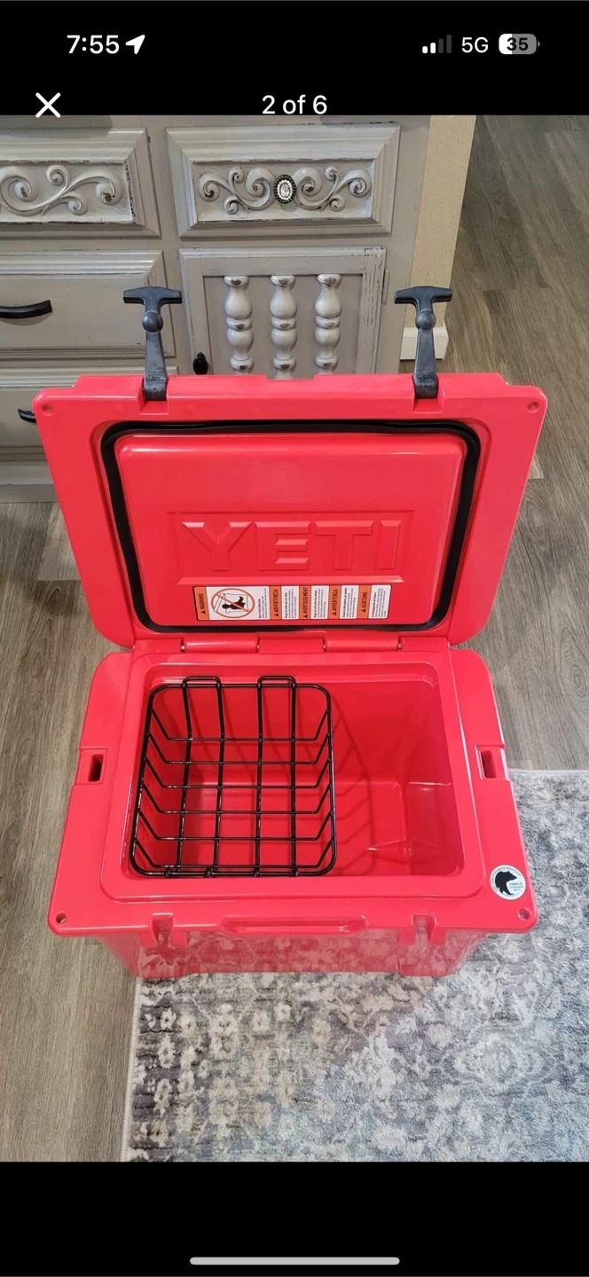 Selling a new red Yeti Tundra 35 hard cooler! This cooler is super durable and perfect for camping, fishing, or just keeping your drinks cold on a hot day. It has a basket inside. Great for keeping things cool!