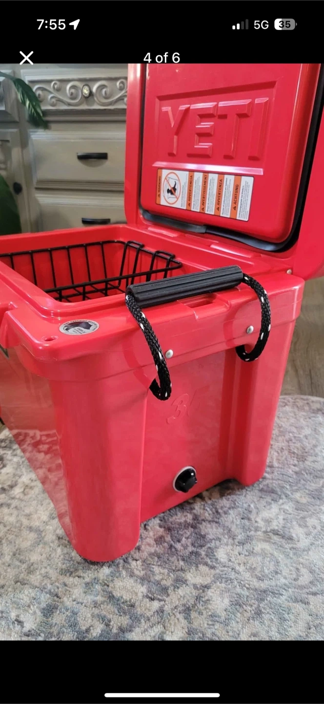 Selling a new red Yeti Tundra 35 hard cooler! This cooler is super durable and perfect for camping, fishing, or just keeping your drinks cold on a hot day. It has a basket inside. Great for keeping things cool!
