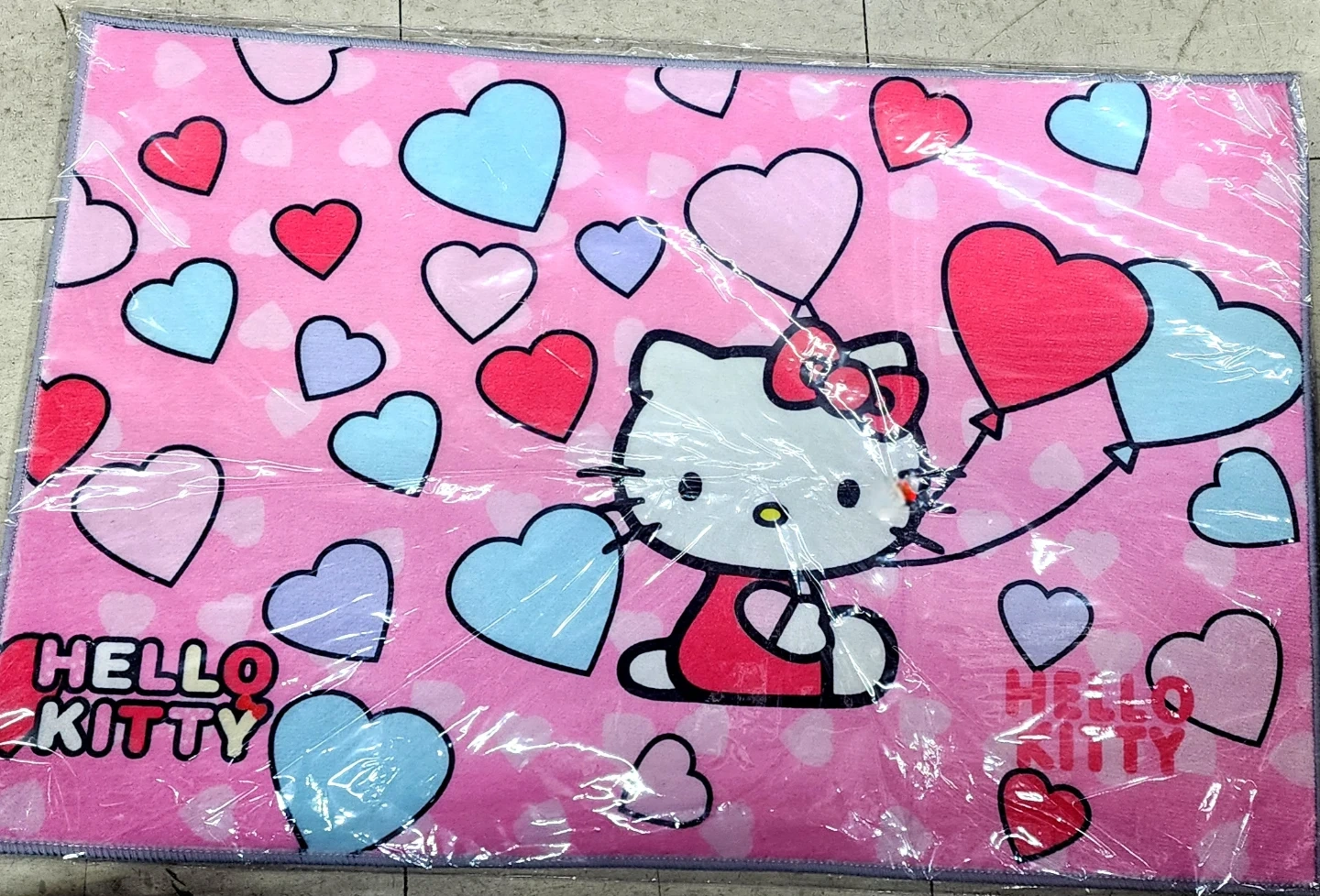 This adorable Hello Kitty rug features a cheerful pink background with scattered hearts and a cute depiction of Hello Kitty holding balloons. It's a fun addition to any room!