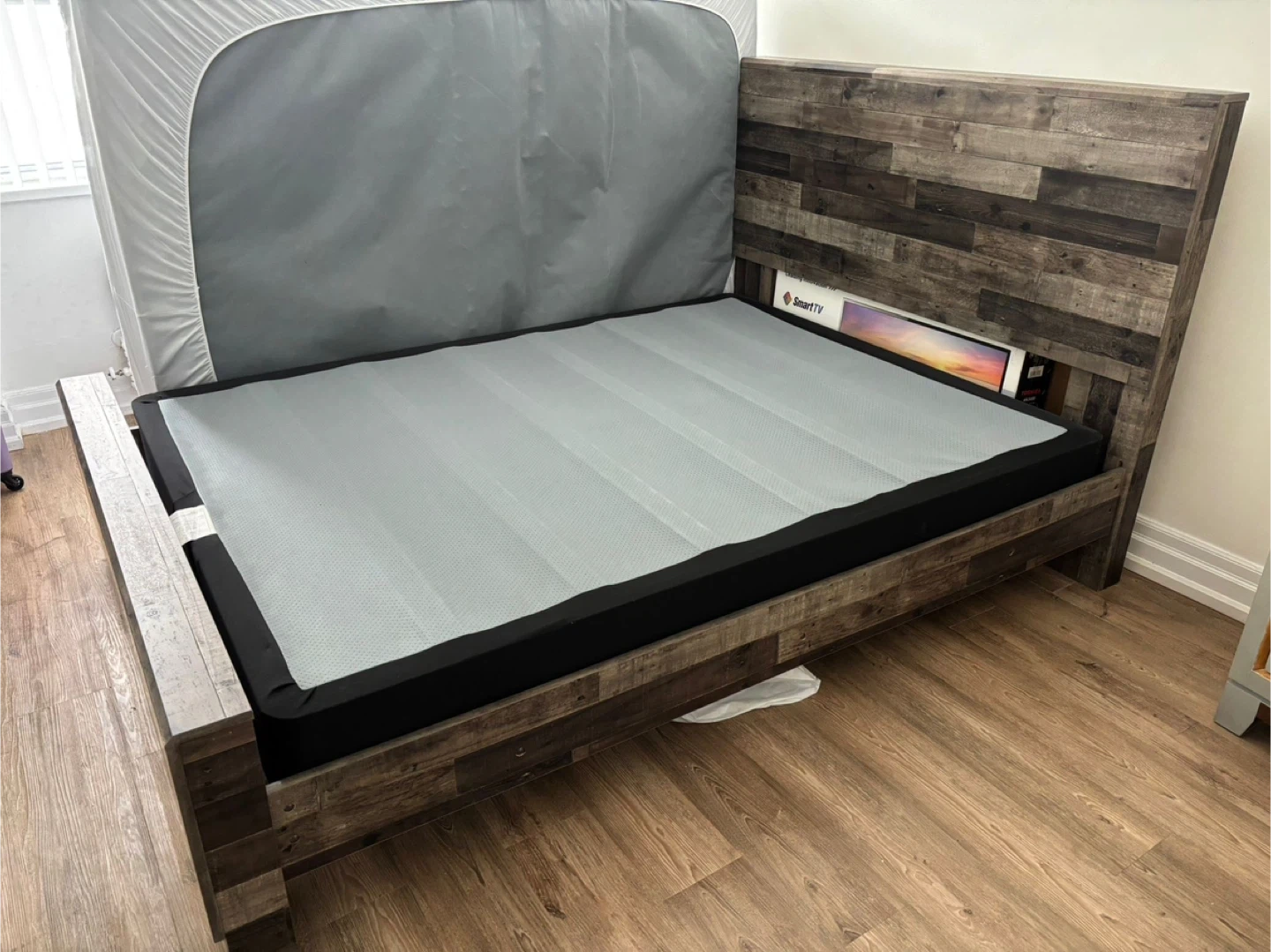 This queen bed frame features a rustic wood plank design for a charming, farmhouse look. It includes a sturdy headboard and a supportive foundation for your mattress. It's a great addition to any bedroom!