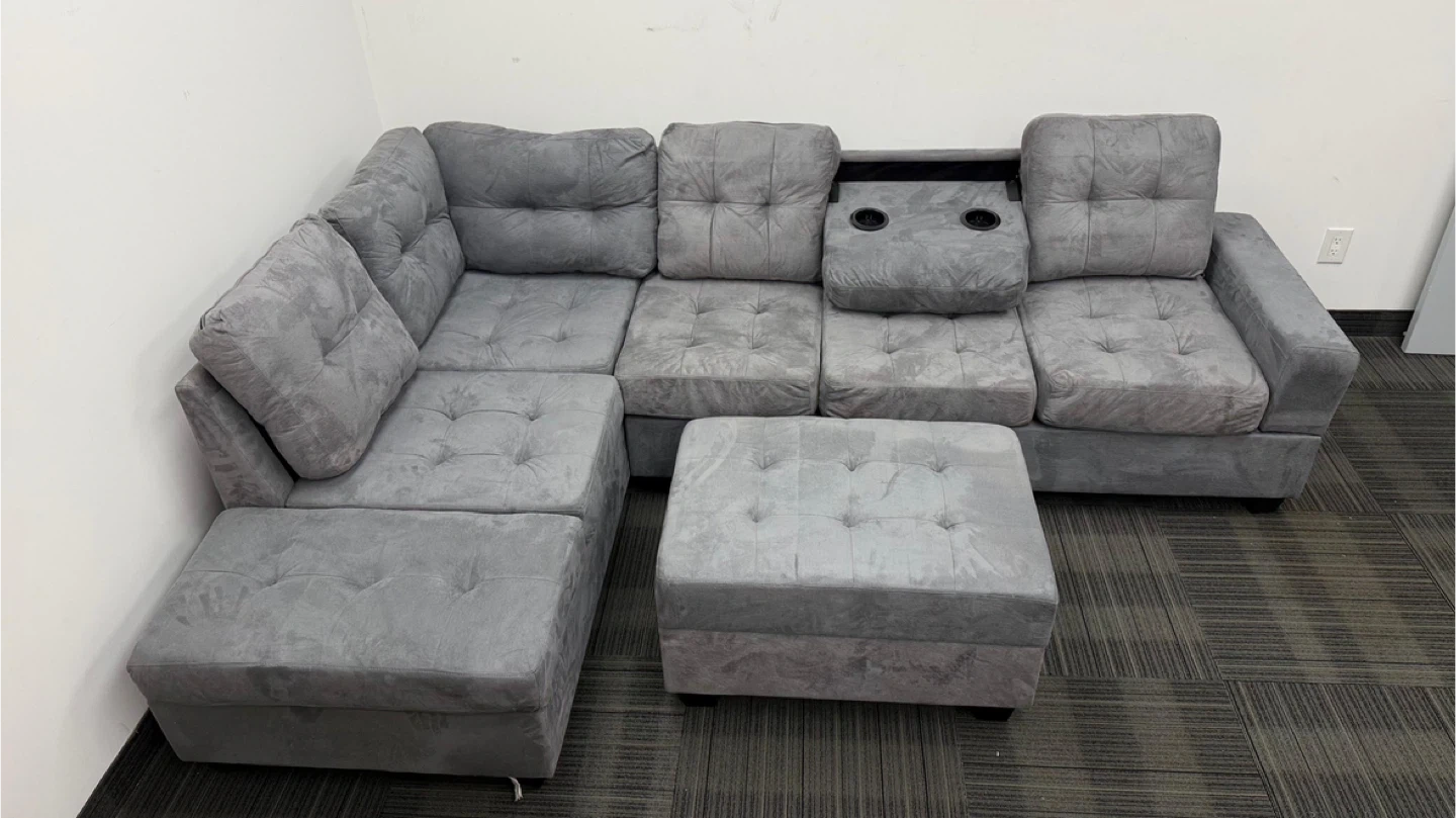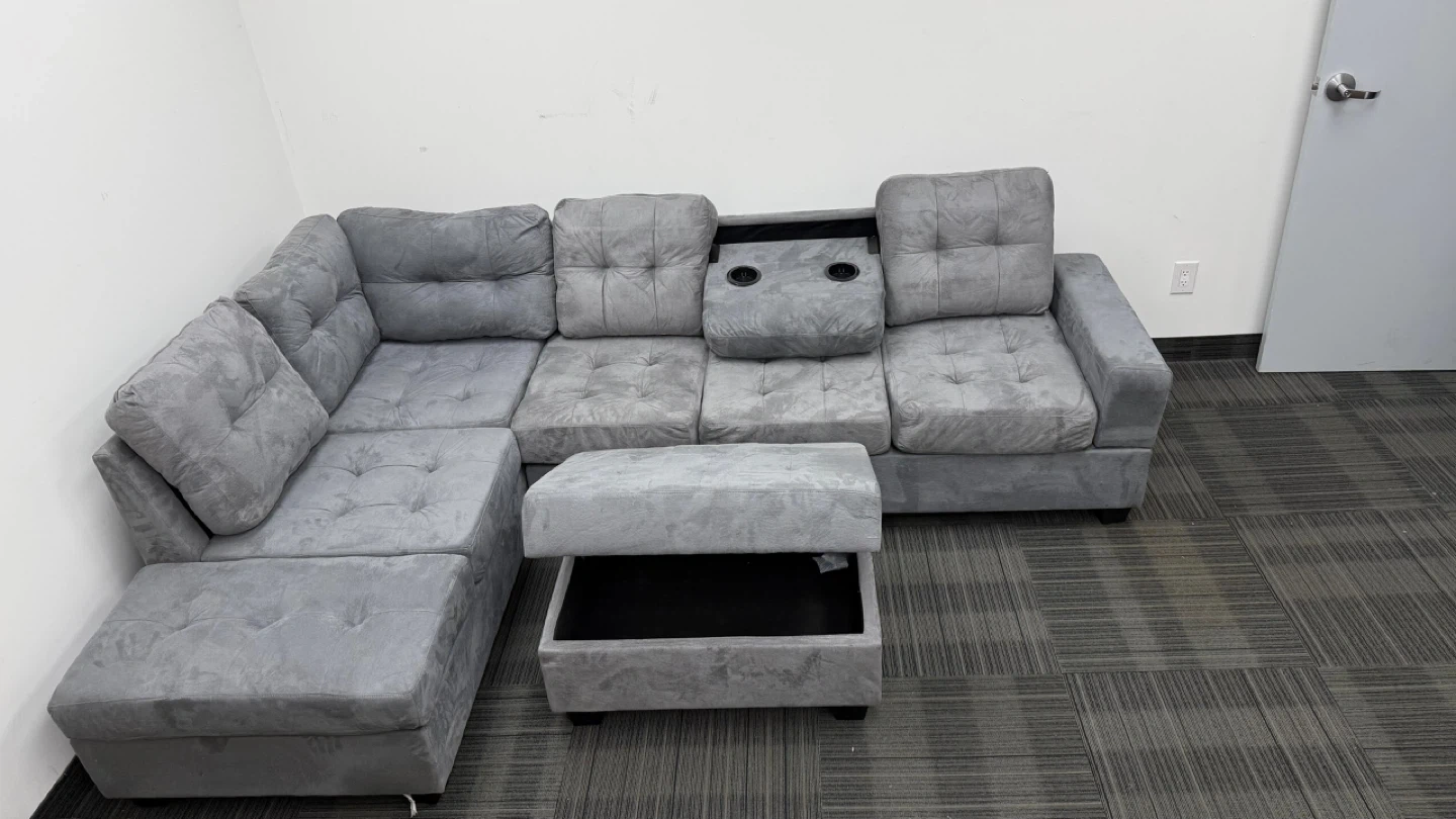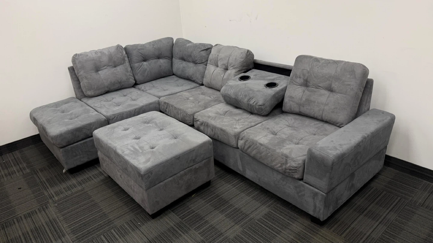 This grey sectional sofa features tufted cushions and includes a storage ottoman. It's a comfortable seating option for any living space. The ottoman offers convenient hidden storage. FREE DELIVERY π