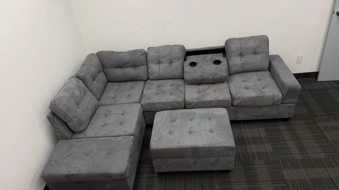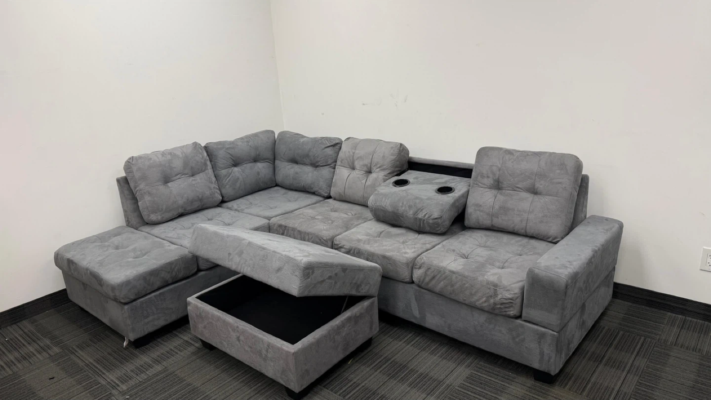 This grey sectional sofa features tufted cushions and includes a storage ottoman. It's a comfortable seating option for any living space. The ottoman offers convenient hidden storage. FREE DELIVERY π