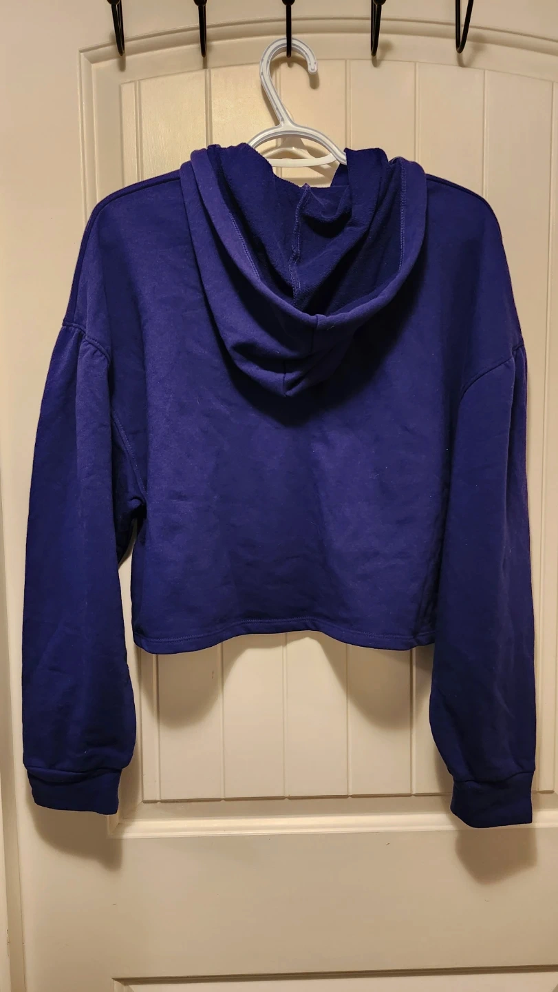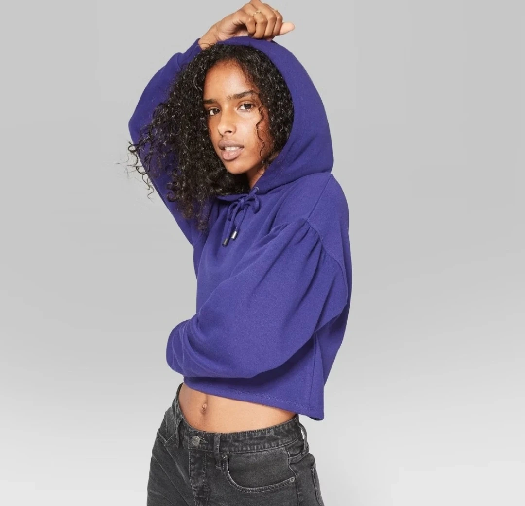 This is a Wild Fable cropped hoodie in a size small. It's a vibrant purple colour with long sleeves and a drawstring hood. A comfy pullover for everyday wear!