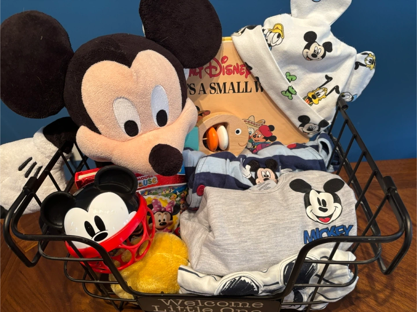 Adorable Disney Mickey Mouse themed baby gift basket, beautifully arranged and ready to gift. This set includes a mix of practical baby essentials and cute keepsakes any Disney-loving family will enjoy.
