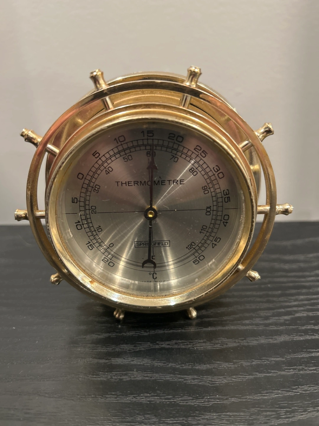 This Springfield thermometer features a nautical ship wheel design with a measures temperature in Celsius and Fahrenheit. It's a great piece for home decor or for monitoring ambient temperatures!