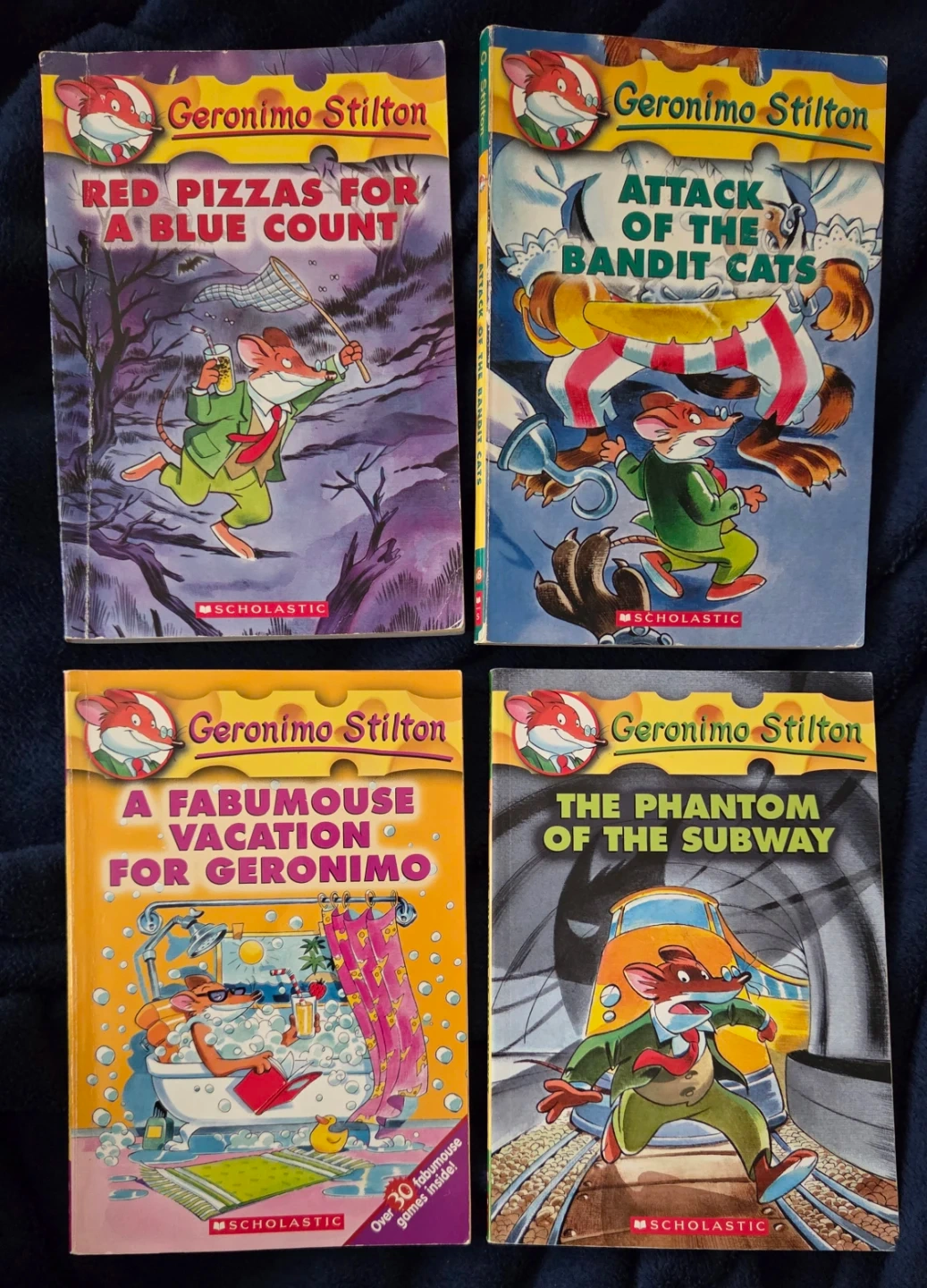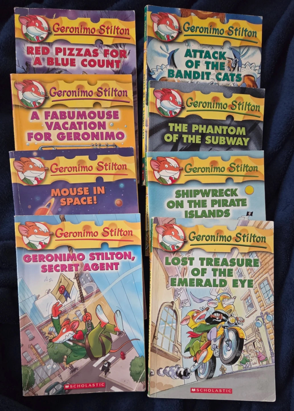 This is a collection of 8 Geronimo Stilton books. Titles include Red Pizzas for a Blue Count, Attack of the Bandit Cats, A Fabumouse Vacation for Geronimo, The Phantom of the Subway, Mouse in Space!, Geronimo Stilton, Secret Agent, Shipwreck on the Pirate Islands, and Lost Treasure of the Emerald Eye. These books are great for young readers.