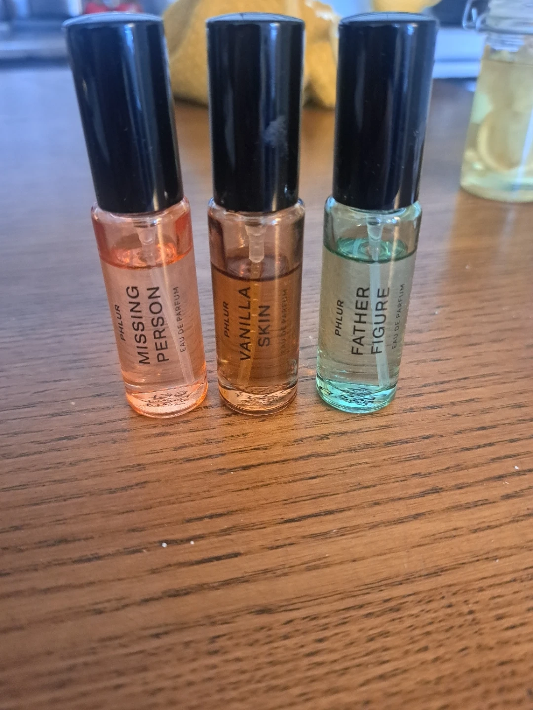 Three PHLUR Eau de Parfum travel-sized sprays are included: Missing Person, Vanilla Skin, and Father Figure. Each bottle is a different colour and contains a unique scent.