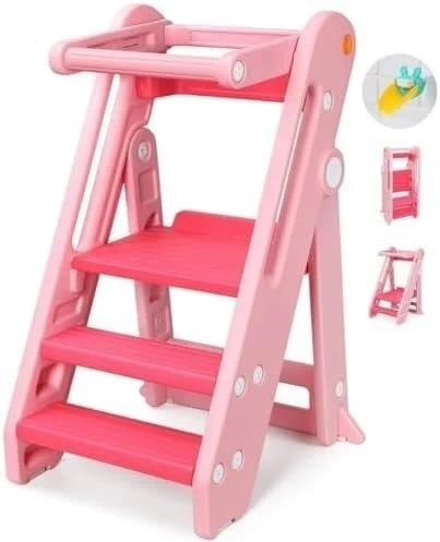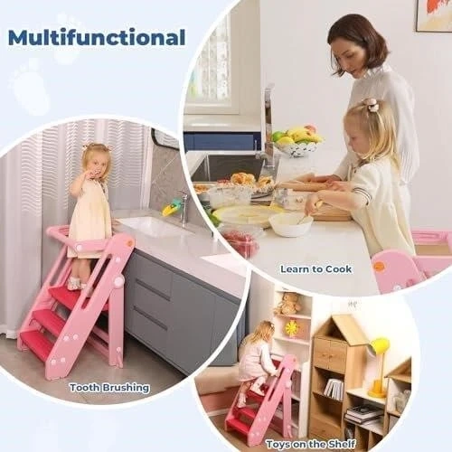 Adjustable kids step stool. This learning tower is great for little ones. Height adjusts from 3 to 2 steps, works for different ages. Helps kids reach the counter for cooking or sink for brushing teeth. Also good for getting toys off shelves.